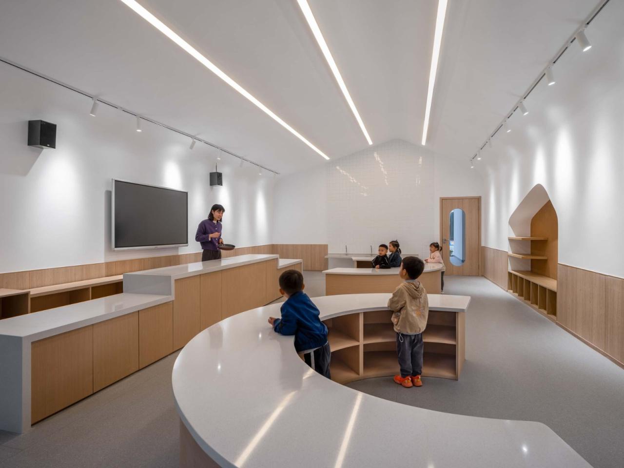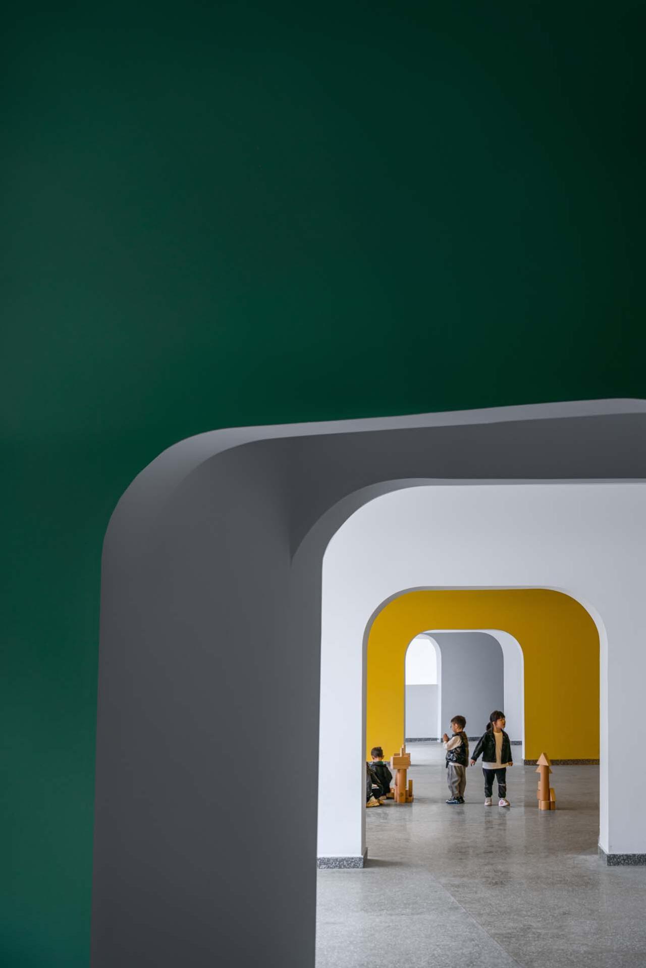 负责通行的两座小房子连通了“山谷”与校园出入口和地下接送区,巧妙地解决了场地高差,兼顾了私密性,景观楼梯引领着孩子们通向童话王国的“山谷”。用作学习的小房子包含了音体室、专业教室等,室内环境明亮通透,让孩子们在寓教于乐的环境中快乐地学习成长。弧形倒角的门洞串联起庭院、街道和花园。多重动线交织,孩子们在“山谷”中的各种“洞穴”中任意奔跑穿梭。