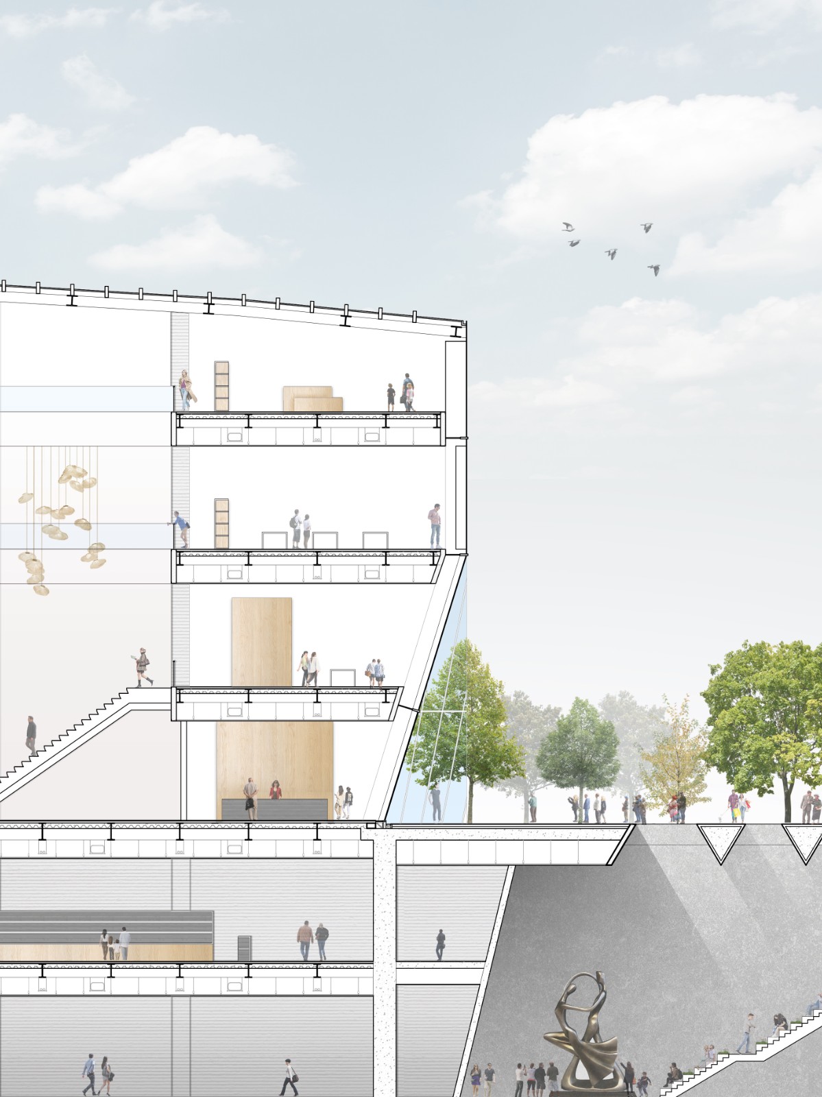 基于对共存和共享的生活品质的定义,建筑使用和设计方式遵循“社区理念”和“多样性”。两心一馆,共三个建筑,三个文化功能既分可合,立体平台和垂直关系连接城市与公园,促进互动,实现全龄化参与,一如共生共长的“多维文化艺术山丘”。