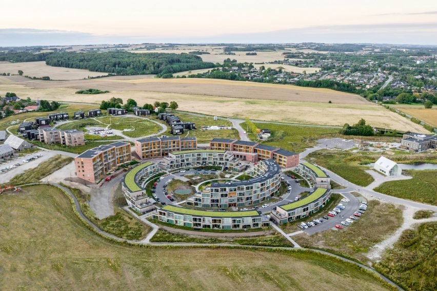 开发商塔克集团(Taeker Group)的“蜗牛住宅”(Sneglehusene)包含93套住宅,是奥胡斯北部Nye社区的一部分,使用BIG和承包商CJ Group开发的模块化系统创建。六个弯曲的楼房,从一层到四层不等,从由BIG景观工作室(BIG Landscape)设计的中央公园围绕着一个小池塘盘旋而出。