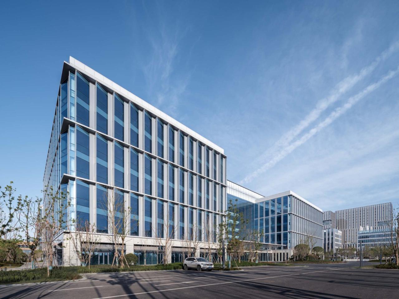 建筑外观精细化本项目分为研发办公楼和配套楼两种建筑类型,立面设计与建筑的类型相匹配。两栋研发办公楼立面呈现三段式构图:首层为石材壁柱基座,体现建筑的稳重大方;办公标准层为锯齿型玻璃幕墙,每三个锯齿单元对应着一个结构柱跨,每个锯齿窗都对应工位的布置,让员工获得舒适而且实用的体验。锯齿窗正面为落地固定窗,通透开放。侧面为铝板开启扇,实用隐蔽;顶部设备层彩釉玻璃围挡,将屋面设备集中到规定的区域,同时为打造第五立面提供良好的条件。
