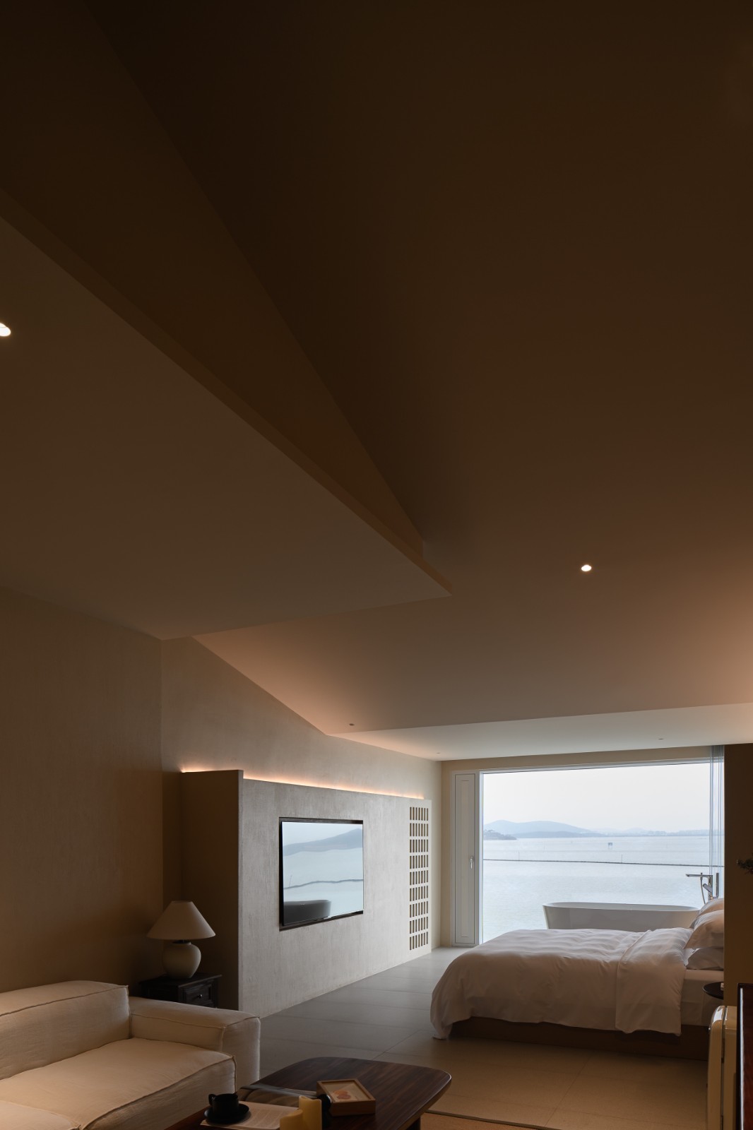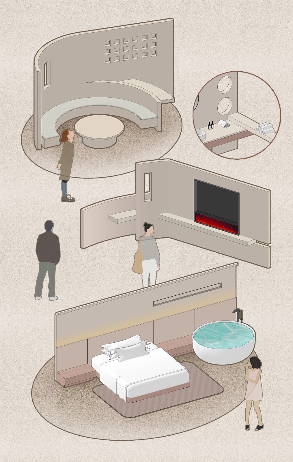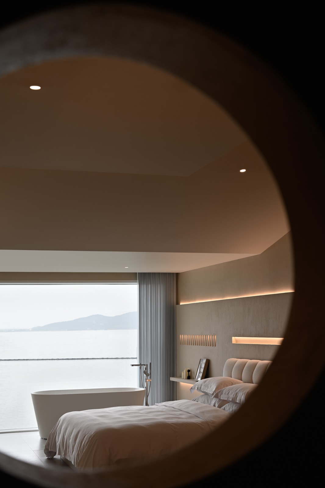 建筑的二、三层皆为民宿空间,为游客提供对话自然的休憩场域。不刻意粉饰空间,而是强调其质朴的内在。空间采用围合、穿插的设计手法,以“隔而不断”的形式划分区域,满足不同的空间活动需求。统一的视觉元素以穿插的形式存在建立空间的秩序感。艺术装饰多是从渔民手里带回的各种贝壳,围合的结构划分出明确的边界线。延续围合与穿插的设计手法,以不同的围合方式以及几何元素的穿插、融合,让空间产生截然不同的体验感。弧形的半围合的设计,在保证空间的延续性之余,区分不同区域的功能性。