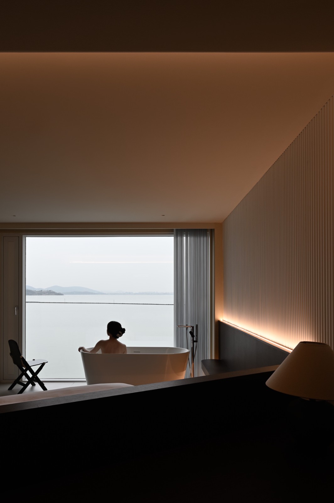 空间里承载着渔民过往的生活碎片,太湖水底的石子铺设在楼梯底部,为空间注入了另一重含义。简朴的陈设与光线交叠。通往上层的楼梯,以老旧与新式结合的形式呈现,保留了部分原建筑的造型,古旧的檩木、椽子露出时光流淌过的印记,与极具现代感的楼梯造型结合,塑造出视觉感官的新旧对话。