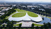 在承载会议功能的同时,永久会址的悬挑屋面、室外规划及景观设计产生了大量与自然相连的宜人灰空间,可让人们自由通达及使用:东北侧一棵原有的古树被保留下来,设计成以古树为中心的下沉阶梯庭院;而场地东南与西南角则分别是连通建筑地下一层室内的下沉庭院。