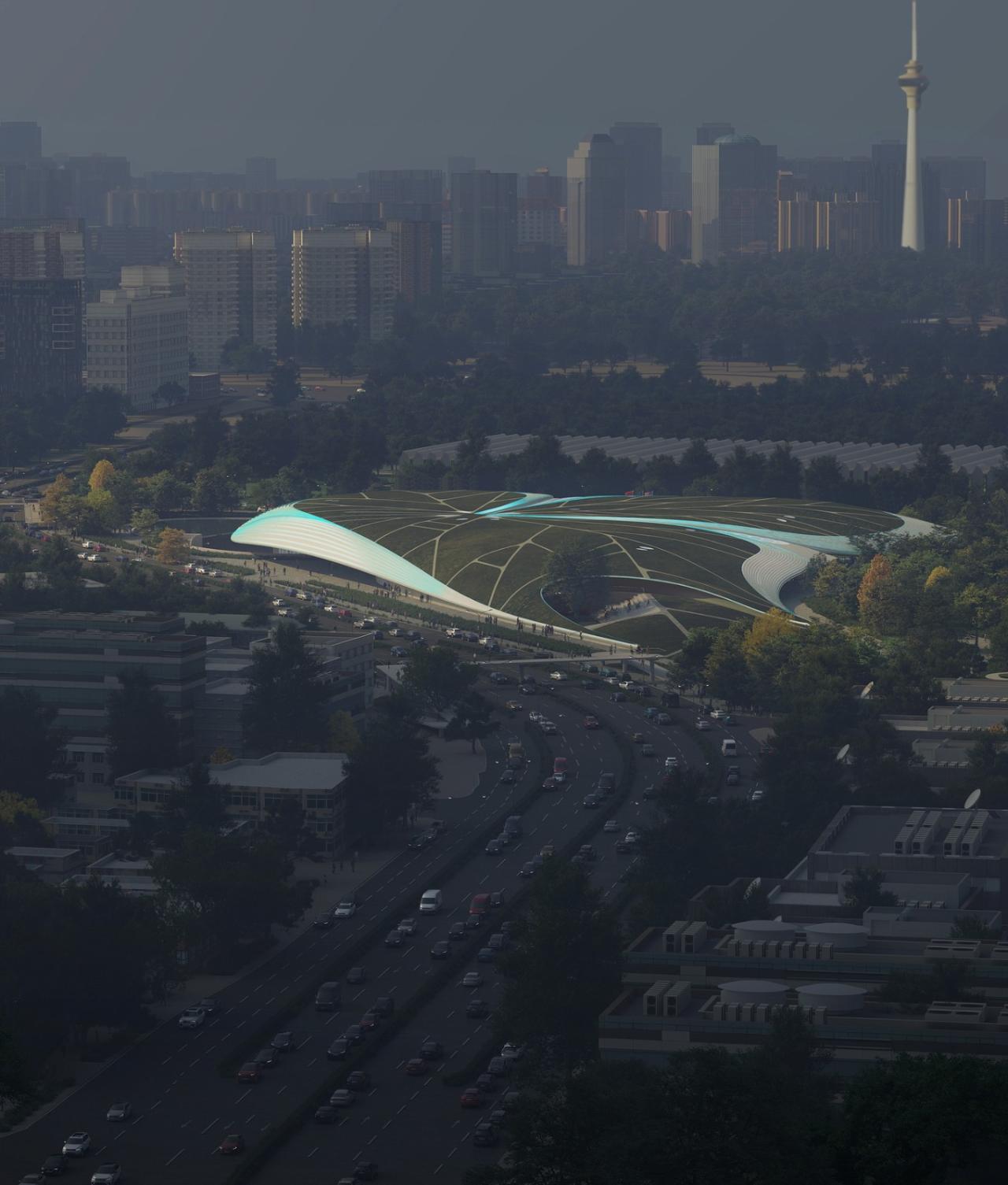 永久会址的形态在大地上由北向南缓缓舒展。从不远处的三山向会址方向远眺,建筑体量消隐于城市中,绿色屋面以含蓄谦逊的姿态融入三山五园大环境中,成为其在城市内的绿色延伸,也成为都市中难得的大地景观。