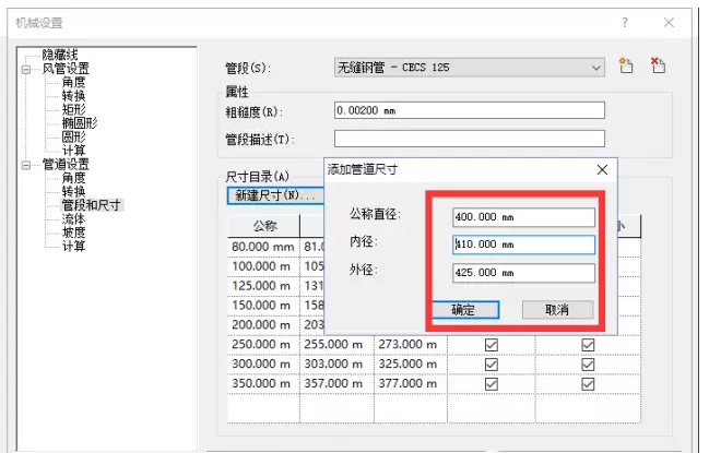 ——看到最小尺寸和最大尺寸,这是我们需要把最大尺寸的管径改成刚才添加的管径,点击确定,这样就完成管径添加。