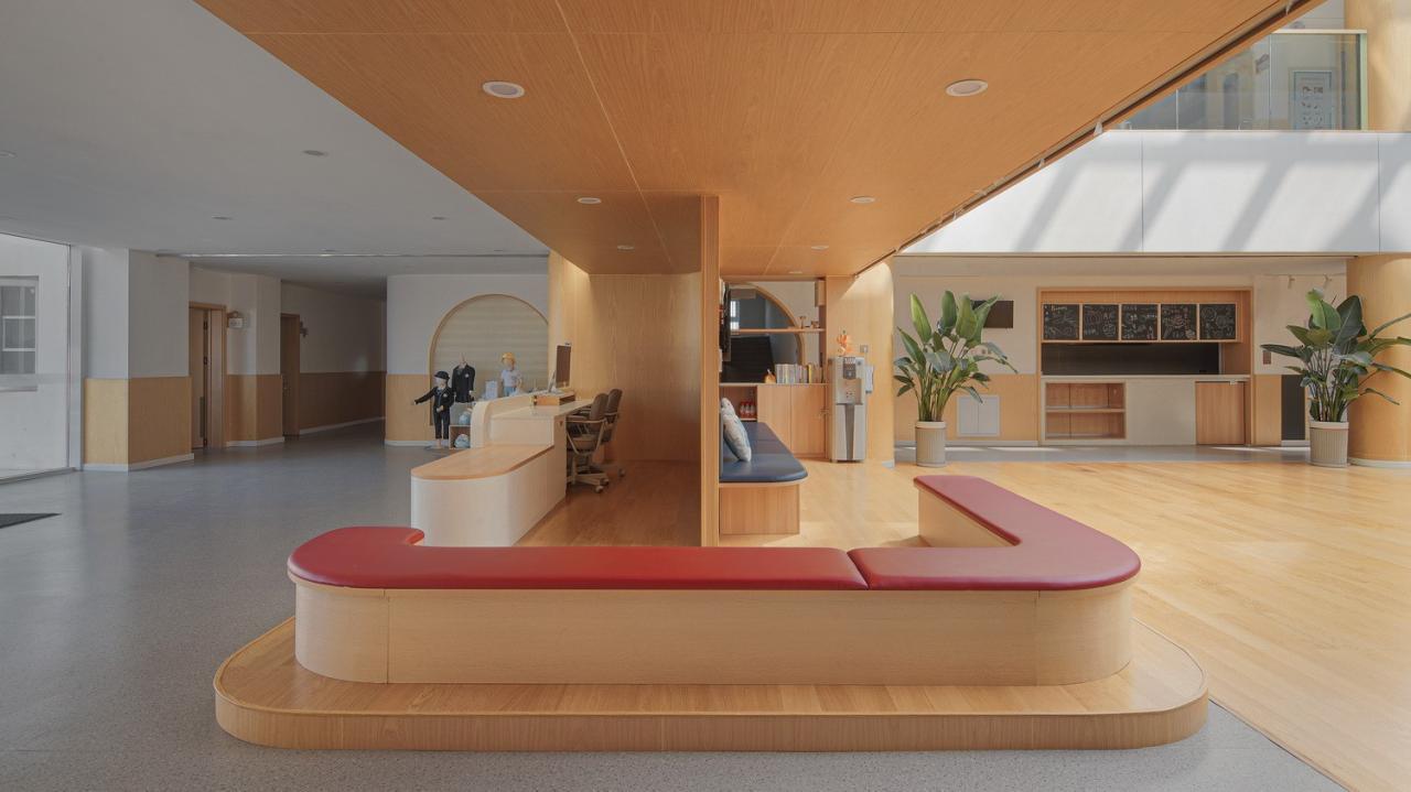 初入大厅,便以阶梯漫步动势开启校园漫游,拉长视觉体验的时间。这种稳定灵活、极简有力的设计方式,也似乎恰到好处的表达了山外关乎幼儿的属性:期待这里能够成为孩子疗愈心灵和承载回忆的地方。