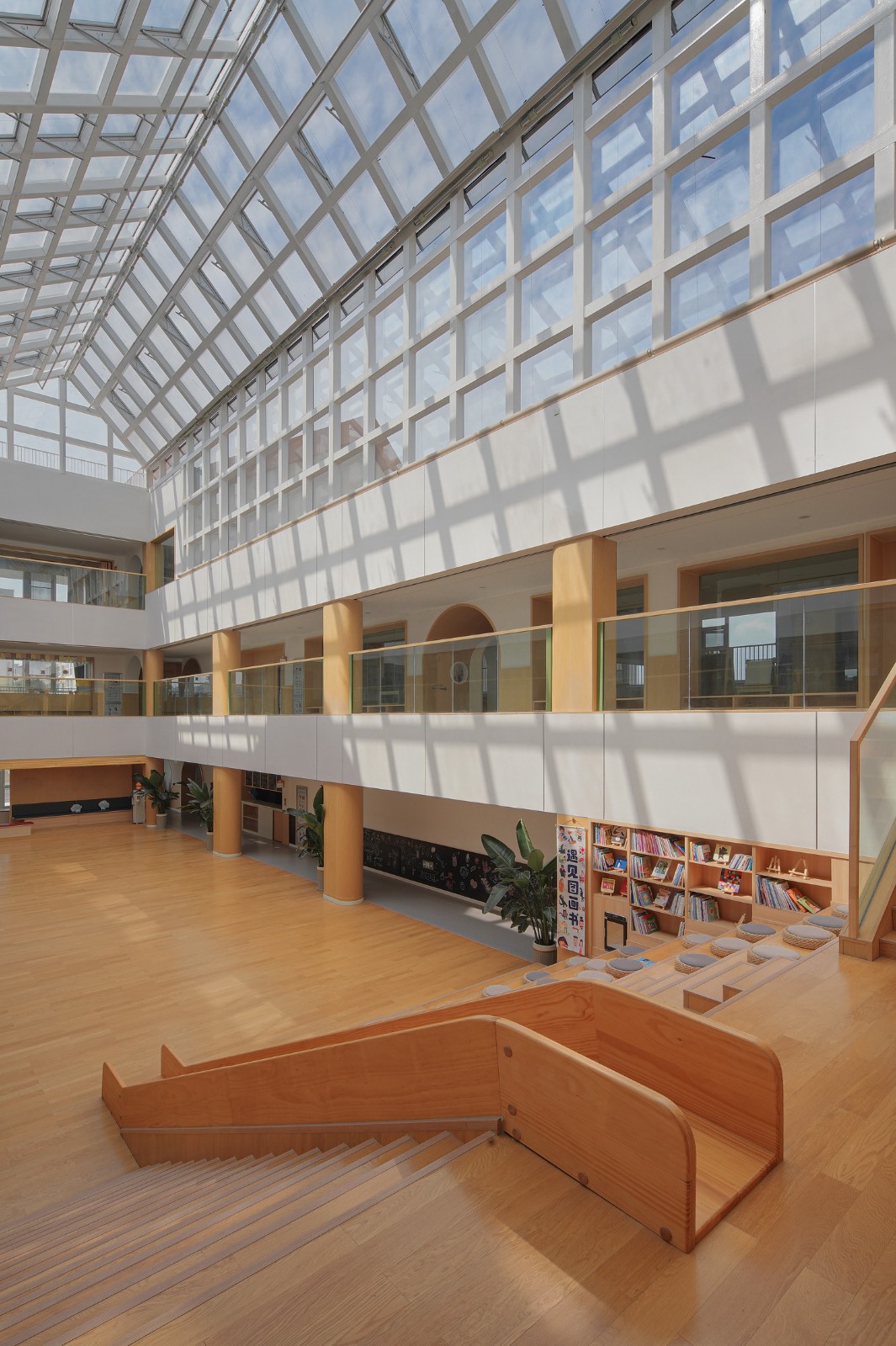 天窗与室内空间联系起来,从而让孩子们进一步地感受阳光,就好像在室外阅读,上课、学习一样,带给孩子新的关于美的启蒙。对于这样的教育空间,我们认为它是为发生亲密感互动而生的,并非只是一个巨大的幼儿园本身。除了拥有比之前所有项目更加深刻的细节外,人文关怀渗入其中在这个项目里得到了充分的应用。包括阅读区及公共空间之外的所有空间,都具备承载各种活动及参与者的属性。