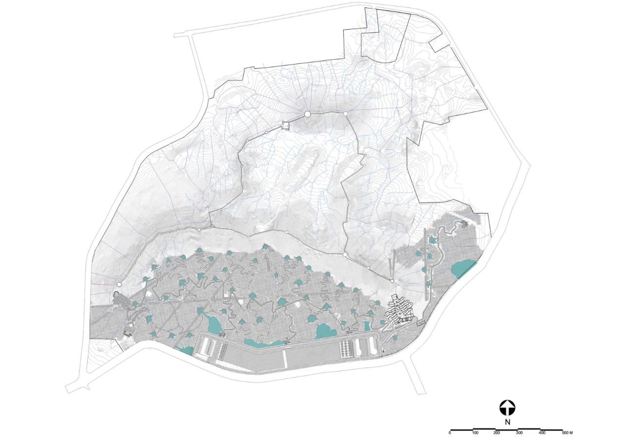 对建筑师来说,这代表着两条相互交织的路径。一条是为作为朝圣者前来缅怀亲人的遇难者家属准备的,另一条是为树木提供养分的寄托之旅,在干旱的卡奇地区恢复活力。建筑师坚信,只需要在开始给予地球援手,直到新的生命自主生根发芽,然后自然就会接管。这种帮助包括识别当地物种、水流路径、土壤和水在途中收集的养分,最重要的是设计储水区让水可以缓慢渗入地下。随后,该项目通过在183公顷(452 英亩)的土地上精细规划出一个个小型水库。第一阶段约81公顷(199英亩)土地的工程现已完成。