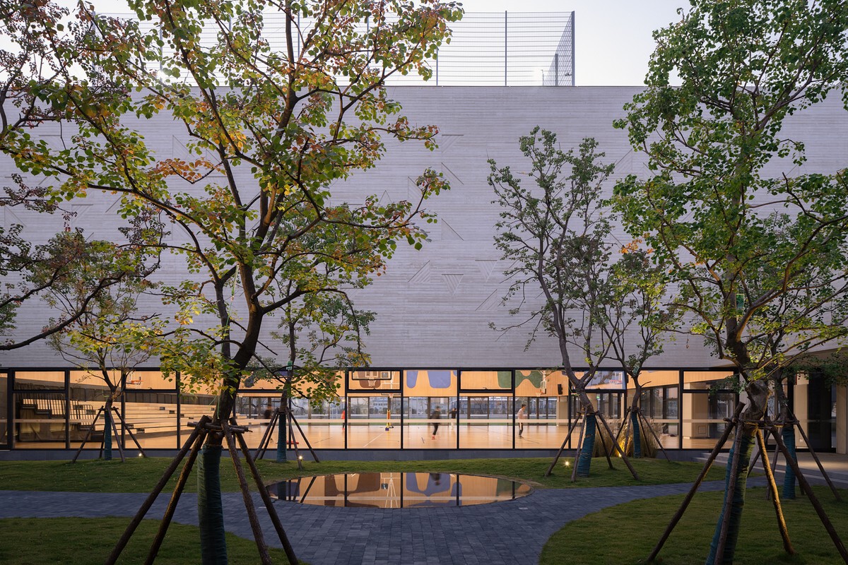 “动”与“静”山峰书院里的五座建筑体量分别包含阅读、体育和表演艺术的功能,它们明暗相间、动静结合,既统一于一个整体,又拥有自己的独特个性。体育馆是一个漂浮的盒子,透明地面向秋园和学校操场,让学生们在自然的围绕中奔跑跳跃。上部的混凝土外立面上凹入的三角形图案组成抽象的肌理。一个室外网球场在体育馆屋顶找到恰如其分的位置。