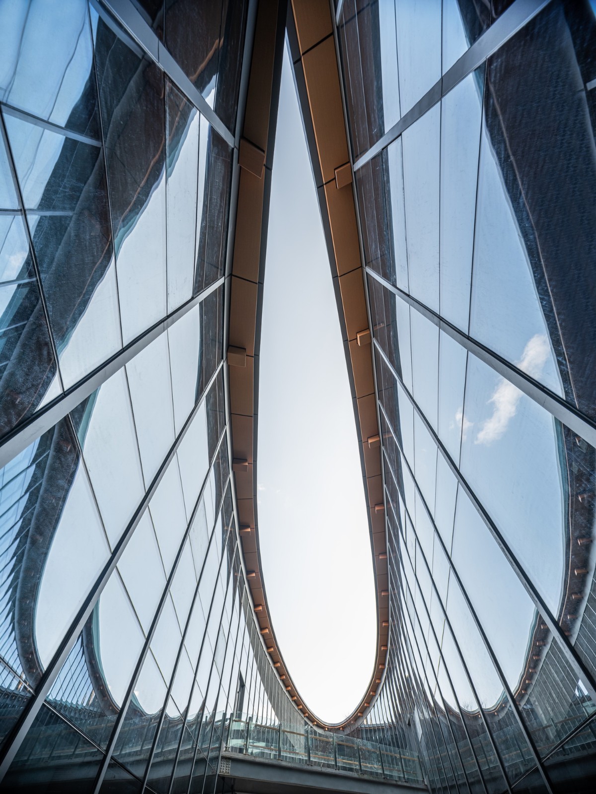 展示中心玻璃全部采用超白中空双夹胶钢化玻璃,数量超过450块。其中,单曲面玻璃单块最大面积16㎡、重1800kg。现场安装时,施工人员将每根钢管的电脑定位座标提前用全站仪三维空间定位,再用激光经纬仪配合跟踪测量,使用一台25吨吊车和一台75吨吊车协同吊装。而56块双曲面玻璃的加工安装则是难点中的难点。每块玻璃都需要根据不同曲度四次制模才能合片成型,每块面积9.6㎡、重1200kg,安装倾斜度更是达到了70度,加工难度大、工艺尤其复杂。