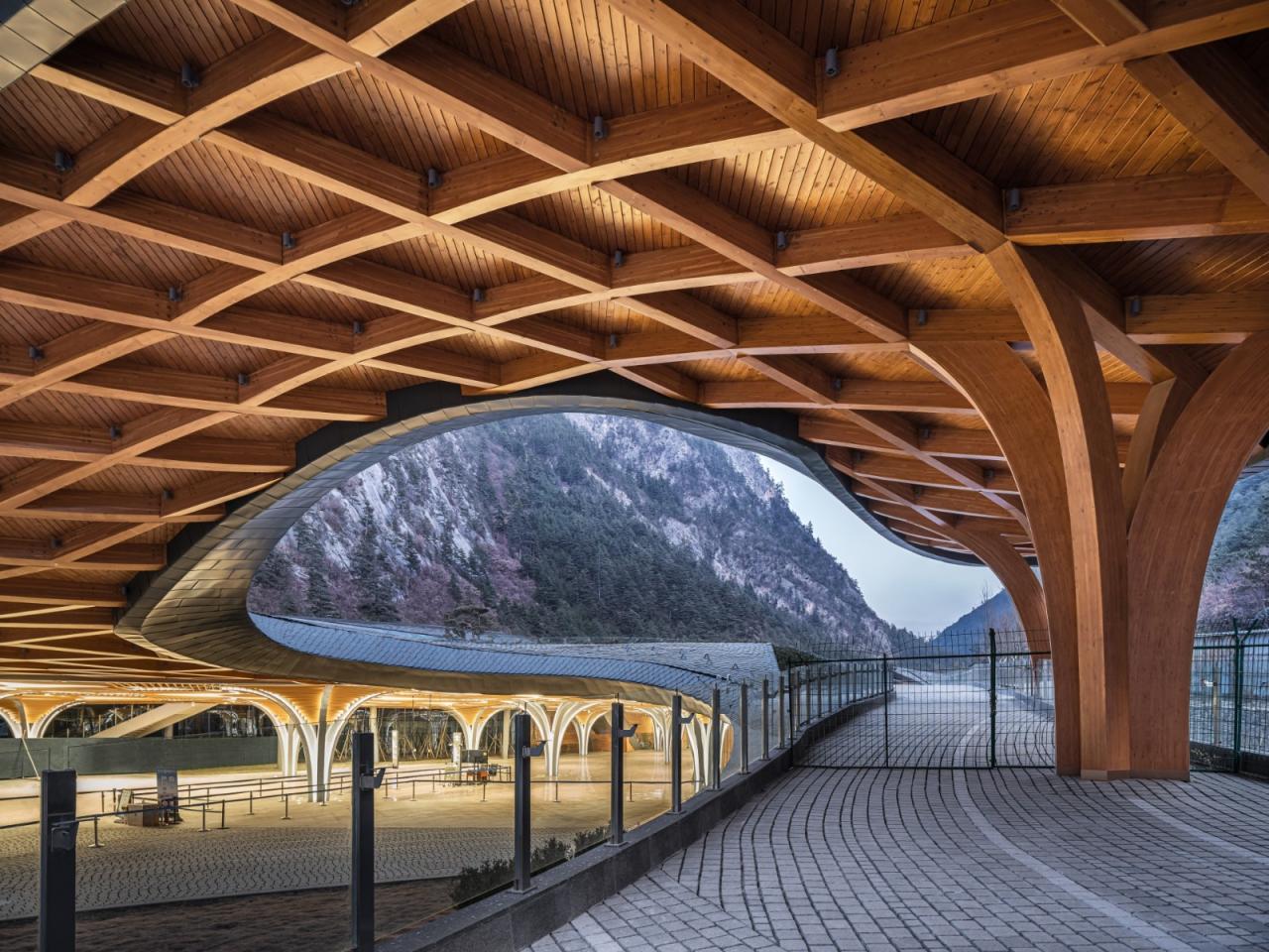 大罩棚采用三颗开花柱顶起跨度38米的大型不规则形态单层网壳胶合梁木结构,这在国内实属首次。罩棚西侧为坡度小于8%的坡道,游客沿坡道缓步走上平台上层集散、换乘,罩棚拱形起伏如山形的屋面采用九寨沟当地的石板瓦,结合罩棚前象征九寨的水、形似藏文元音的符号,形成了最具地域特色的标志性入口。平台上层的罩棚下为入口检票区域。该罩棚由两道钢结构空间曲梁封边,以费马螺旋线分格的胶合梁作为共同受力结构体系,跨度41米,由集散中心平台上缓缓涌起,以自然、舒展的框景将连绵起伏的群山揽入画境。