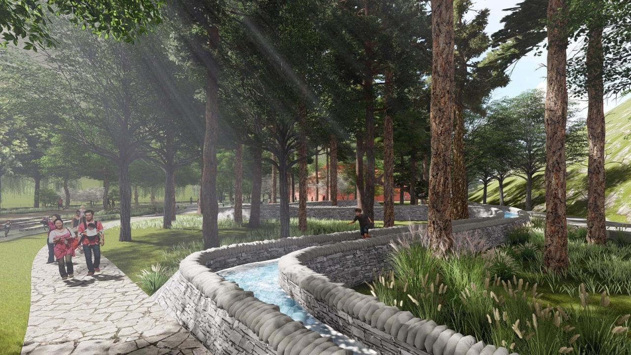 景观设计游客中心东侧为林卡景观。该部分由建筑学院朱育帆教授团队设计,林卡景观以水为母题,在翡翠河东南岸打造“藏地林卡”。创造了丰富的水景观体验,同时,通过保留现状植被,塑造疏林草地景观,再现林卡风光。疏解沟口集散广场高峰期间游客聚集压力的同时,为游客和周边居民提供休闲游憩的场所。