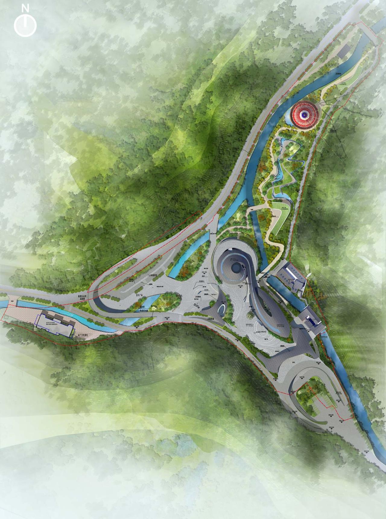 利用场地原有地势,西侧的山边比东侧的翡翠河畔高6米左右,设置了平台层与西侧场地标高持平,作为游客的主要出发层;平台下层比翡翠河水位略高,作为游客主要的到达层;在游客高峰时段,平台层和平台下同时作为出发层,游客可快速进沟游览。在出发层可以饱览沟口的三山两河,成为进入景区的前奏。集散中心充分利用原场地高差,既避免了地下水位过高给施工带来的诸多困难,又造就了平台形象的亲近感。