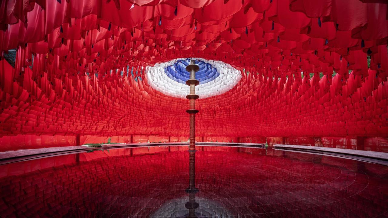 平台下的集散空间有6000多平方米,考虑让这个空间既自然又让游客心理感受不压抑,将原本单调的立柱跨距拉大,以拱形钢梁解决跨度增大后的受力问题,形成六个方向的连续拱,当六个方向的拱汇合在一起,就形成了开花柱——一种力学和美学相结合的、富于自然特色的结构形式,这种钢结构柱不需要额外的装饰,结构即是建筑,受力即是装修,既表达了力学之美,又节省了装修投资。36棵开花柱托举起平台下的集散空间,象征着一年四季九寨沟的美景,又一次用建筑语言向自然致敬。开花柱丰富的柱头形态为集散平台下空间平添了富于韵律的美感,在实际运营当中,即使数千人进入该空间,游客也不感觉压抑、低矮,反而成为了沟口最具特色的半室内空间。