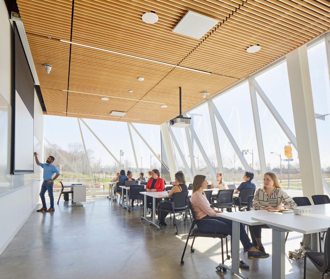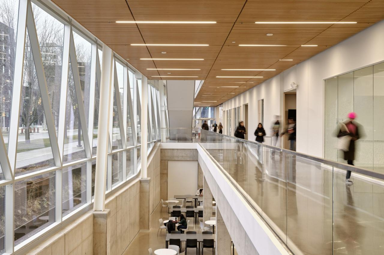 建筑以大胆的扭转形体为该学院创造了一个新家空间,定义了校园的南边区域,并塑造了一个全新的步行广场。该建筑可容纳高度灵活的学习环境、社交和协作空间、以及供学生和教职工使用的办公室。高大明亮的空间品质可促进继续教育学院社区、文化和身份认同的建立推广。