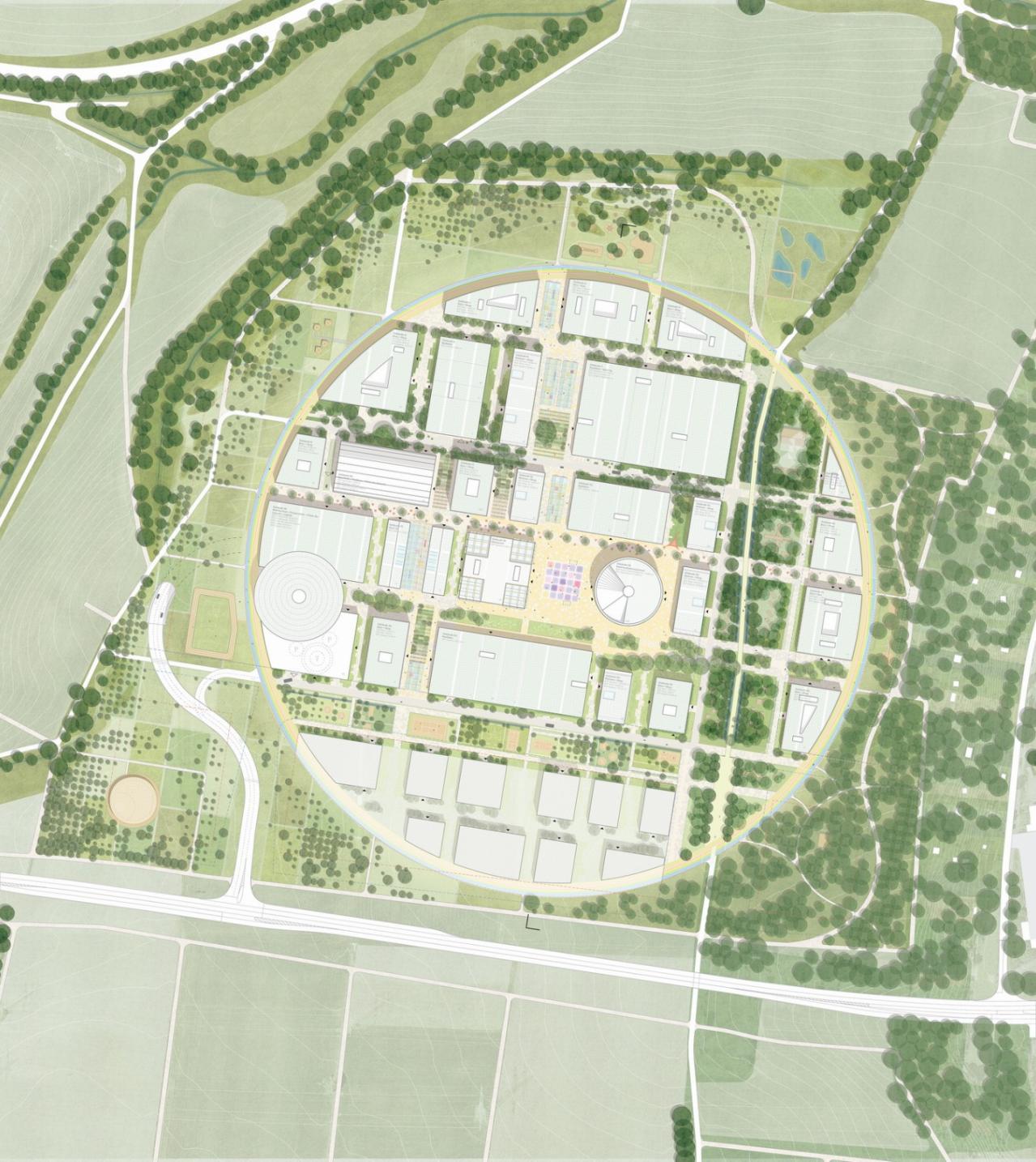 海尔布隆市政府与 Dieter Shwarz 基金会共同领导了该德国竞赛。为了打造一个享有盛誉并强大到足以与世界知名科技中心相匹敌的园区,MVRDV将整个总体规划圈在一个“圆”内,旨在使 IPAI 园区具有识别度,使其在卫星照片中可见。该圆周长为1.2 公里,包括一个短跑道和滑板公园,以及带护栏的看台和俯瞰周围景观的观景台。