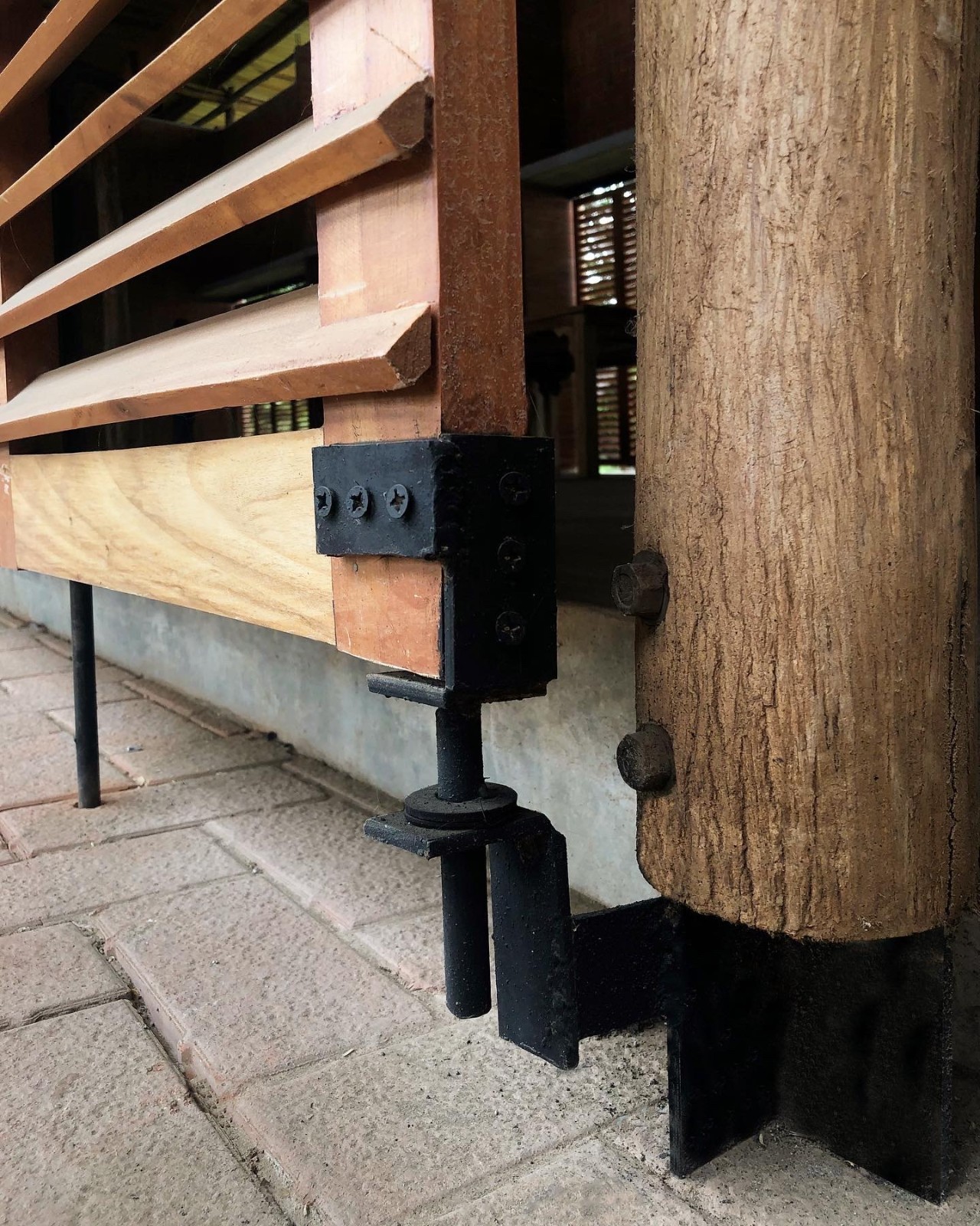 建筑采用了圆形截面柚木。这一材料具有良好的硬度及耐用度,因此常被用于打造当地高脚房屋底部的主要支撑结构,同时也可以支撑上层的屋顶或楼板。项目中的砖墙采用了人字斜纹排列,这一纹理也让墙体由于互锁的砖块而变得更为牢固。木制折叠格栅门则被用于控制通风量、采光量,同时也成为了内外空间间的联系。