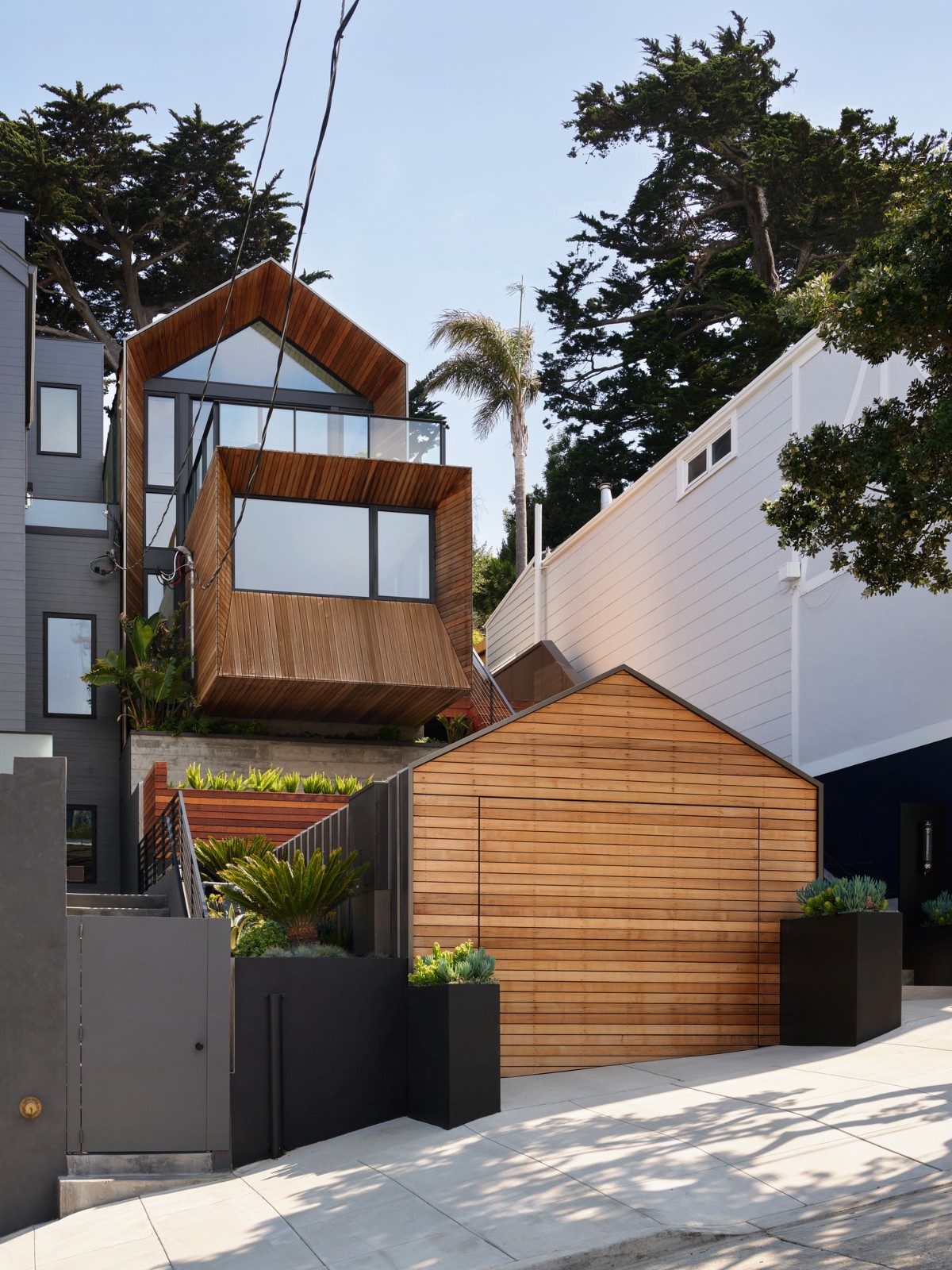 房屋的形式相互交织,突出的是雪松、固定接缝金属和水泥面板的材料调色板。这些形式,连同内部的调色板,在一个完全开放的平面内创造了房间。逐渐增强的形式出现在前端,向典型的旧金山乡土建筑致敬。