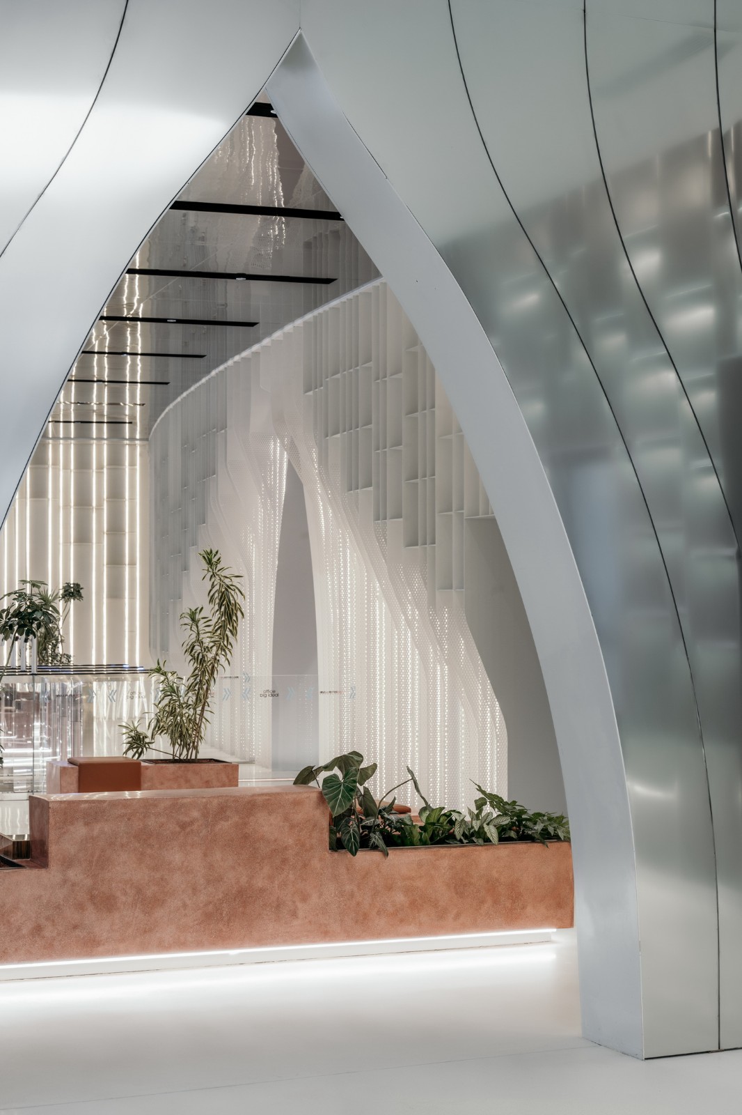 我用穿孔的方式让金属失去其物质第一性。但如果我就一层,无非是在建筑外立面蒙个面纱。张斌老师在13年前评论我的无极书院外立面时用了“层层叠叠的资本主义语言”。这个层层叠叠触动我在日后不断尝试用穿孔板在立面上形成体积最后成为外立面,不是夹克的面料而是夹克本身。层层叠叠的穿孔板制造了具有偶然性和不确定性的半透明金属外立面形成空间从而促动我进一步去塑造内部。未来,全金属大约就是我的创作方向之一。钢雨是我创作的一个阶段性成果。