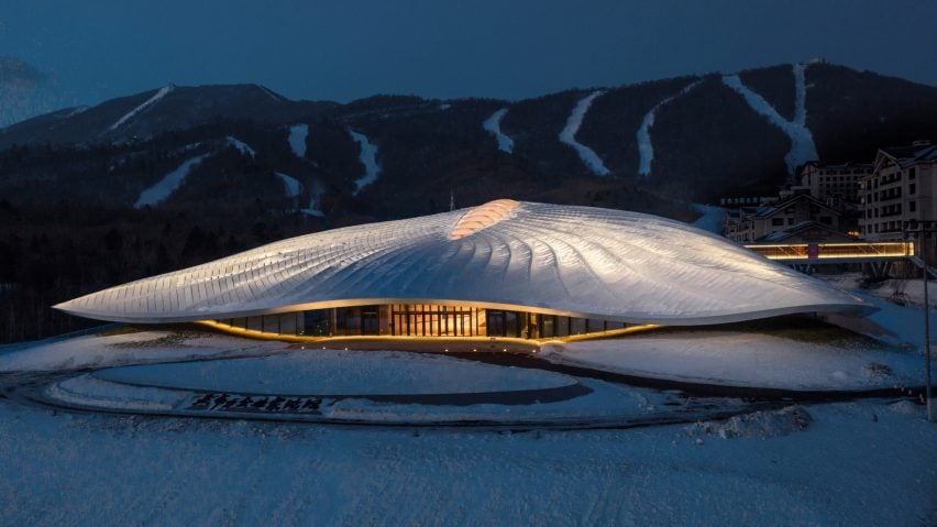 这个会议中心由中国马岩松工作室(MAD)设计,位于中国东北部黑龙江省亚布力滑雪场附近的一座山上。碧甫照明设计有限公司为该项目进行的照明设计入围了2022年Dezeen奖的建筑照明设计类别,旨在帮助这座具有悬挑屋顶的帐篷状建筑与周围环境融为一体。