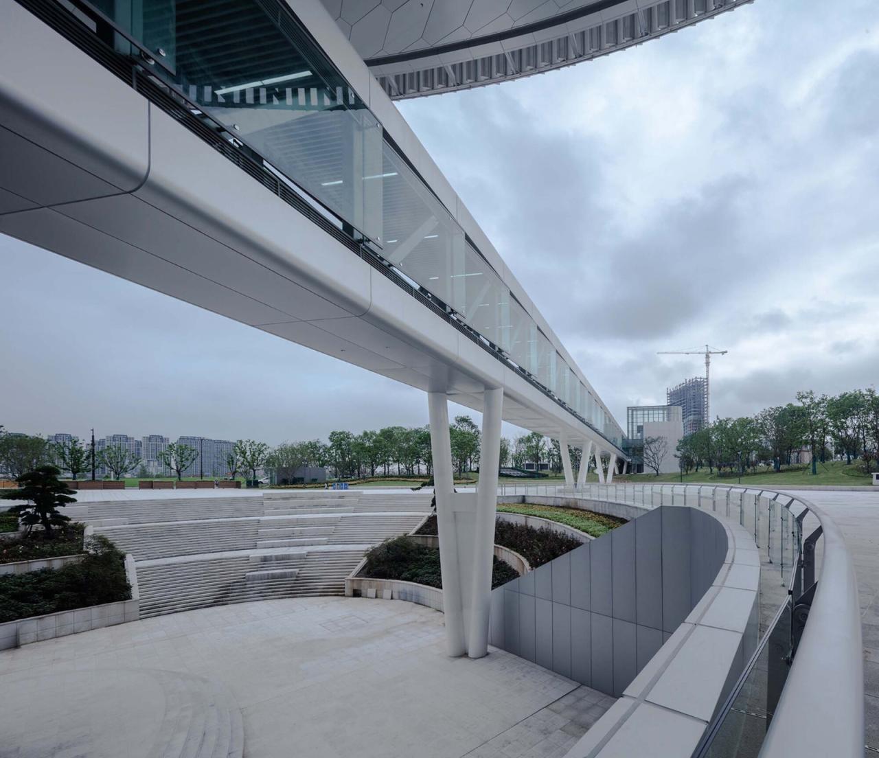项目设计灵感来源于“缓缓开启的宝盒”,整体体量由两个直径 104m、高 16m 的巨型“圆盒”组合而成,两盒相叠后缓缓开启,塑造出鲜明的城市意象及开放的城市空间。从实际需求及使用效率出发,在下层“圆盒”中设置公共服务、市民活动、科普教育等功能,并与业主方一起对原设计任务书做出适当修正:增加了艺术展示、演艺培训、儿童科普、创意空间等更加贴近市民日常生活的功能,使其成为真正满足市民活动的功能集群。为表达地域特征,我们还在下层“圆盒”内部置入了一座富有东方意蕴的立体园林。小桥流水、亭台楼阁,通过开放通道与城市公园紧密相连,实现了内外延续的自然景致。廊,这一传统园林的要素,将培训、创意、科普、书店等现代功能串联到一起,形成了绕园而行、步移景异的独特体验;院,取代了传统的集散大厅,成为指定功能外的市民第二活动场所,也让园林显得开合有度。在尝试复原中国传统园林空间要素的同时,我们更期盼能创造一种现代与传统的对话。