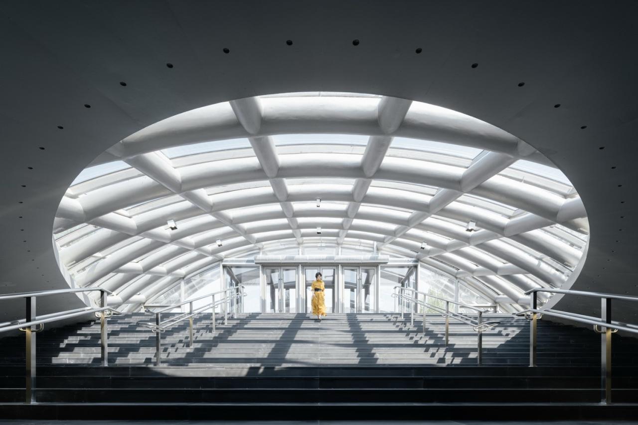 我们在陈列馆正门前设计了一个插入地下的单层钢网壳覆曲面玻璃体,往下拾阶而下是艺术宫正厅,回头则在拱形框景里烘托了陈列馆。