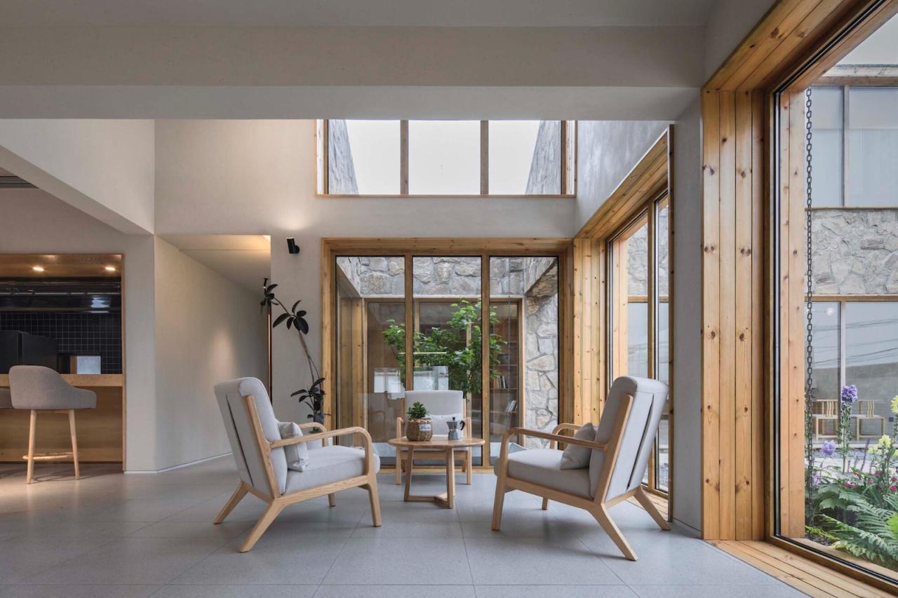 在城市之外的乡村环境进行设计工作时,我们希望能够完成一个转换的过程——在当代的建筑语汇和建造系统中部分地使用传统材料,使之在消费需求、乡村环境和建筑形式等多个要素之间达到平衡。折山院通过置入连续翻折屋顶调整了建筑形态,并因为这一组空间操作带来了建筑中一系列采光和观景的窗的体系,以及正反坡的屋顶下方的特别空间体验。设计将院内原有的两栋独立的房子转变为互相关联的一组建筑,产生了一个干燥、有力的,具有有北方山村特征的整体形式,形成了村里的“新的面孔“。