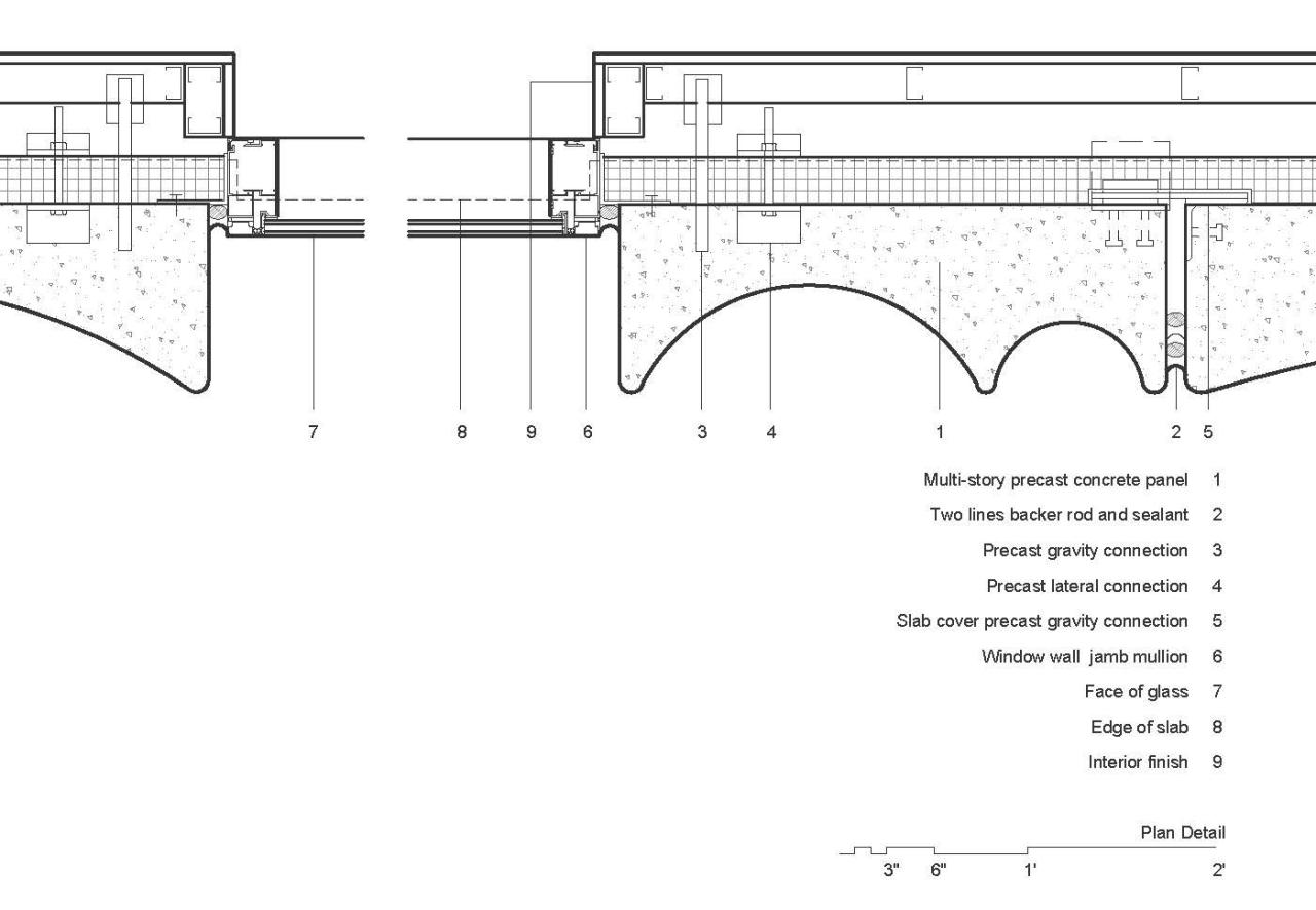 该项目的位置——一个小的、不规则形状的场地,以前被用作停车场–带来了一些设计限制,包括其紧张的城市环境。在设计和施工的早期阶段,建筑围护结构与预制混凝土制造商和外墙安装商进行了沟通协调,以减少施工中的摩擦。该设计突破了多层凹板的制造极限,通常有 20 或 30 英尺高,跨越 8 个主要模具,通过优化施工顺序来减少安装时间。不规则间隔的凹板(由BPDL 在当地制作)和多层凹陷的玻璃幕墙凸显了建筑的垂直度,创造了一个部分与整体的关系,使斯图尔特街 212 号在波士顿的天际线与众不同。