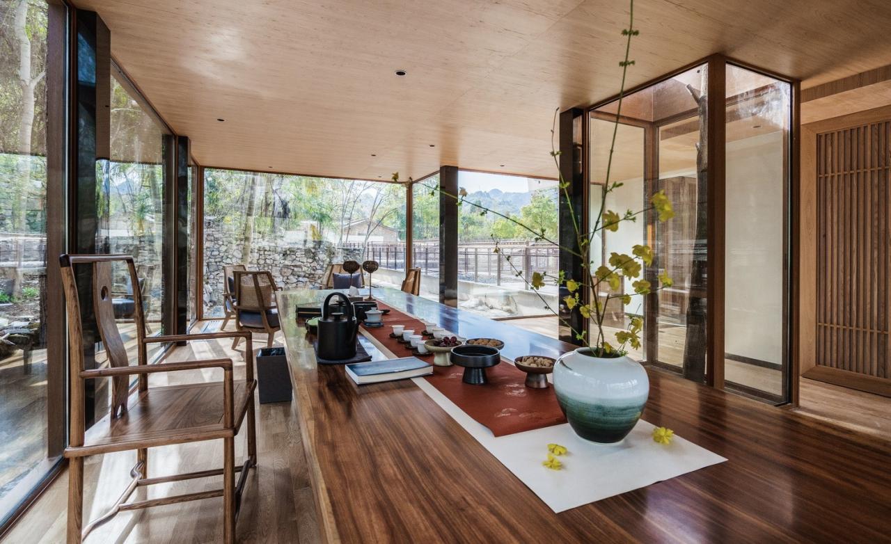 整个酒店的室内空间是结合了庭院交通路径而建立关系,同时更多是基于室内角度的景观纳入关系来布局营造最佳体验感;例如通过前院瀑布主景观进入的接待大厅,可以透过中轴线的大玻璃景窗直接看到后院的景观泳池庭院,与不远的多功能会议室遥相呼应;再如自助餐厅的设计更多是将后山繁盛野趣的自然山景纳入到餐厅视野,甚至通过室外落台直接实现与自然亲密融入。