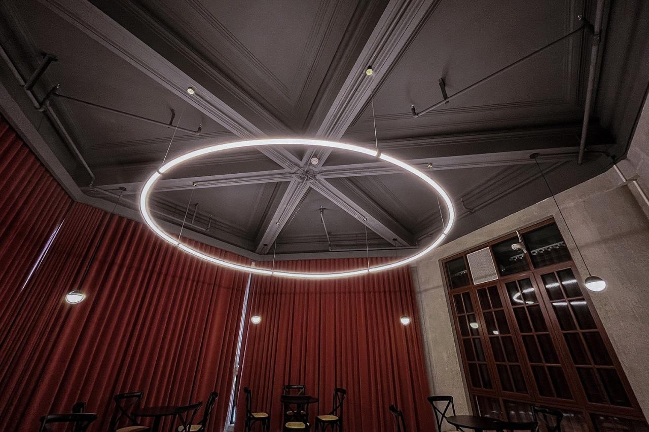 原始建筑的半室外挑台与主体空间脱离,使用率低。我们对空间进行了整合,在不拆除既有结构的条件下,取消原有玻璃门,将挑台与主空间连通。使用帷幕隔离嘈杂的外部城市环境,形成向心性休憩和表演空间,将空置的挑台重新激活。