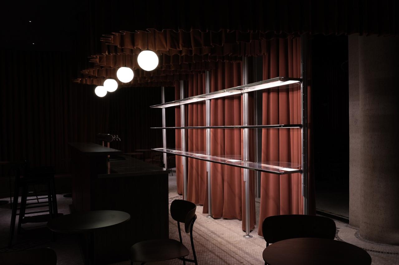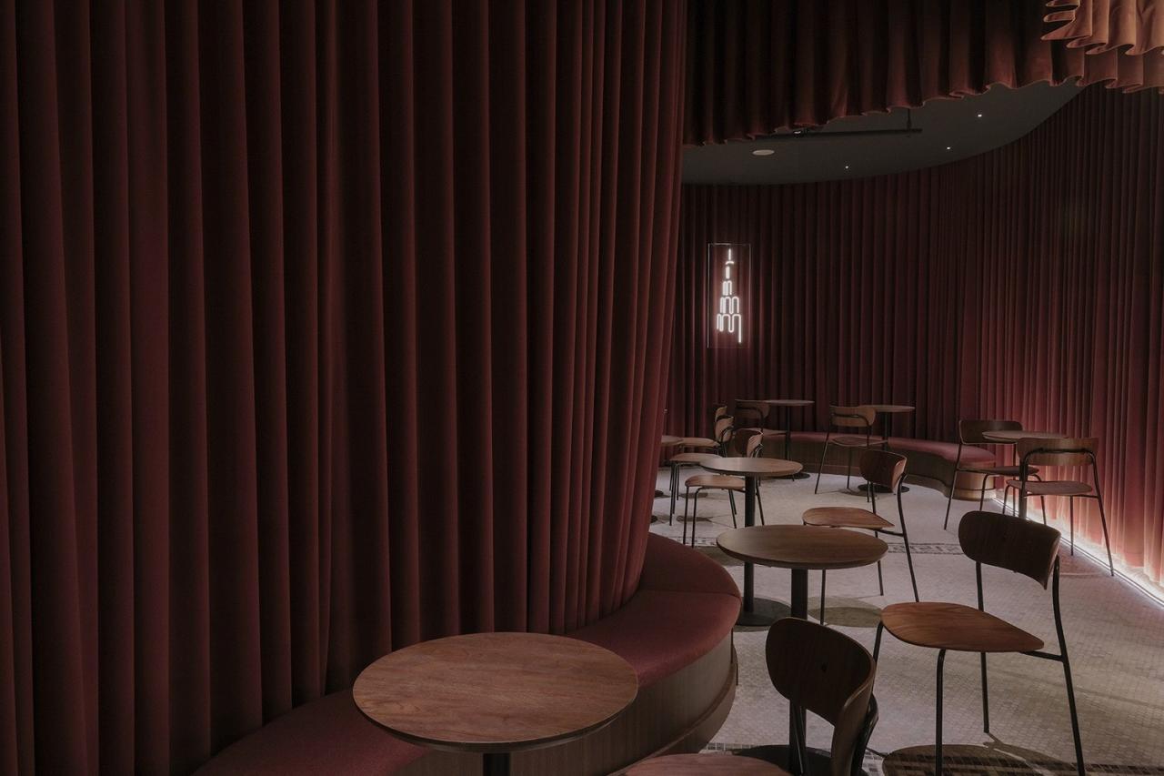 演出时,围合的帷幕形成极具神秘氛围的剧场,演出散场后,半围合的帷幕形成一个可停留可社交的酒吧空间,形成剧场与酒吧功能的一场空间融合。