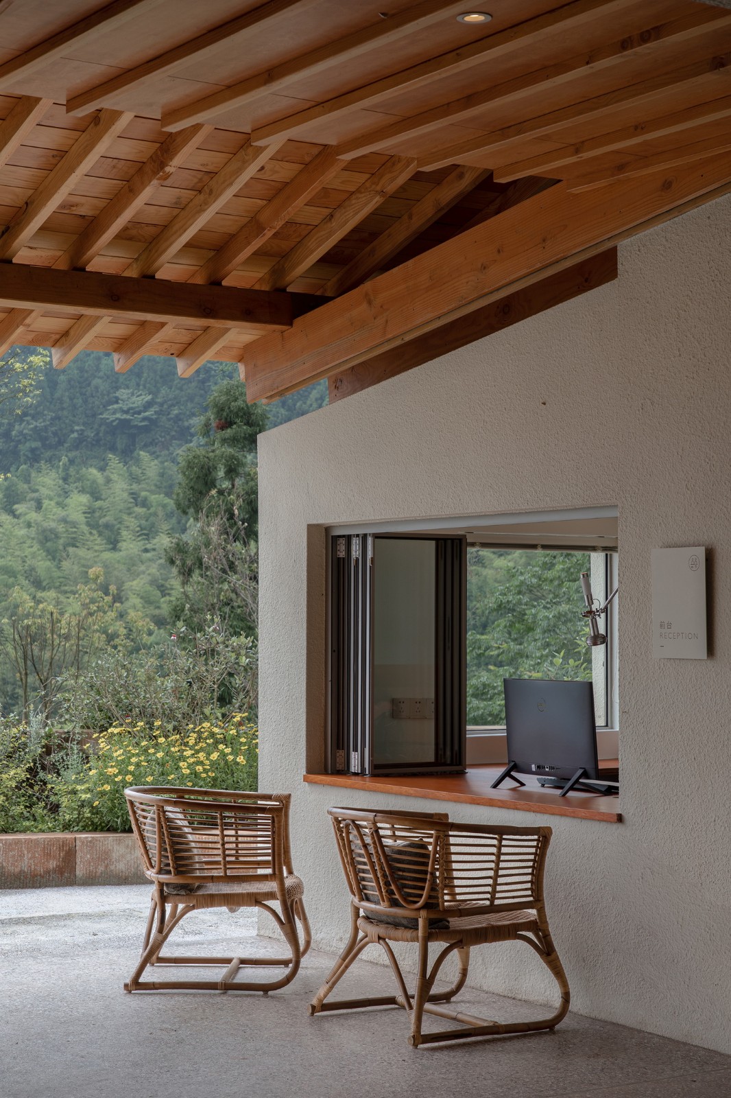 而在建构策略上,我们从尊重地形与气候出发,尽量利用原始宅基和吊脚楼吊层原理,减少山体土方开挖,保留了场地内的大部分巨石和树木,并纳入到与建筑空间的对话中。利用轻薄而出挑深远的大屋面,可以在多雨环境中对建筑的墙面与基础进行最大限度的保护,避免雨水冲刷和溅水侵蚀,极大的延长建筑寿命。