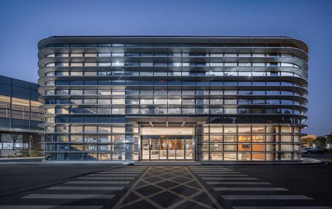 流线型的建筑体采用玻璃幕墙外立面,其上均布着铝合金水平遮阳构件,金属构件的水平运动强化了建筑的流线感,在视觉上使公共建筑和生产车间保持了一致的面貌,尽管二者在立面和空间上仅仅是一些细小的造型变化,但是整个建筑的层次由于变化的介入而丰富起来,线与面的交叠,塑造了建筑独特的形象。当树木逐渐繁盛,填充了那些我们留置出来的空间。透过阳光闪烁和婆娑树影,建筑在咫尺之间映射出自然的丰富。