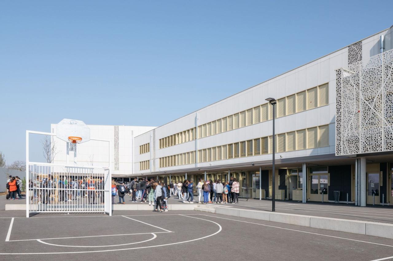中学学生有一个自行车和机车的停放区,由入口大门边上的雨棚遮挡。他们从操场进入教室(项目要求),要穿过位于教学楼下的有顶棚的走道。建筑物朝南的方向允许最大限度的冬季太阳能增益,并通过电动百叶窗(可调节和倾斜的板条)保护教室免受夏季高温的影响。大部分时间,操场只被植被遮挡。在内部,主要的颜色是白色、木材和原始混凝土。