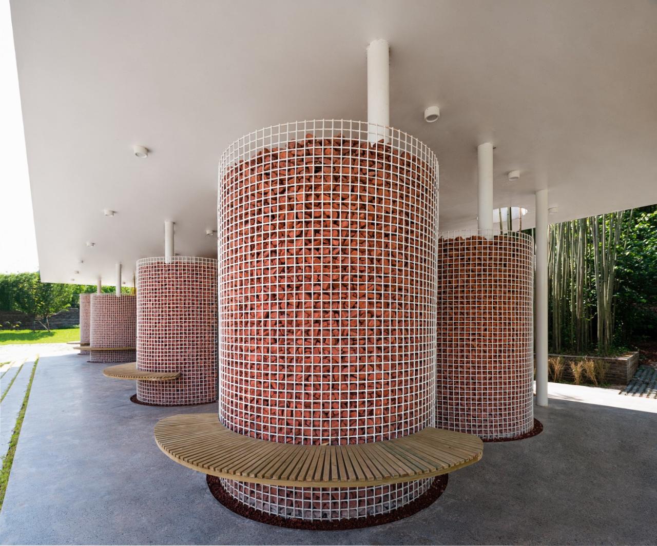 材料上采用了当地的红砂岩。将红砂岩砖碎块填入钢丝笼中,碎块之间自然形成的缝隙提升了空气流通的效率。此外,红砂岩具有防潮和吸收噪音的特性,也非常适配厕所的功能需求。建造过程中通过当地材料的运用以及与当地工人和工艺的积极合作,以在地建造的方式推动中国的乡村振兴。