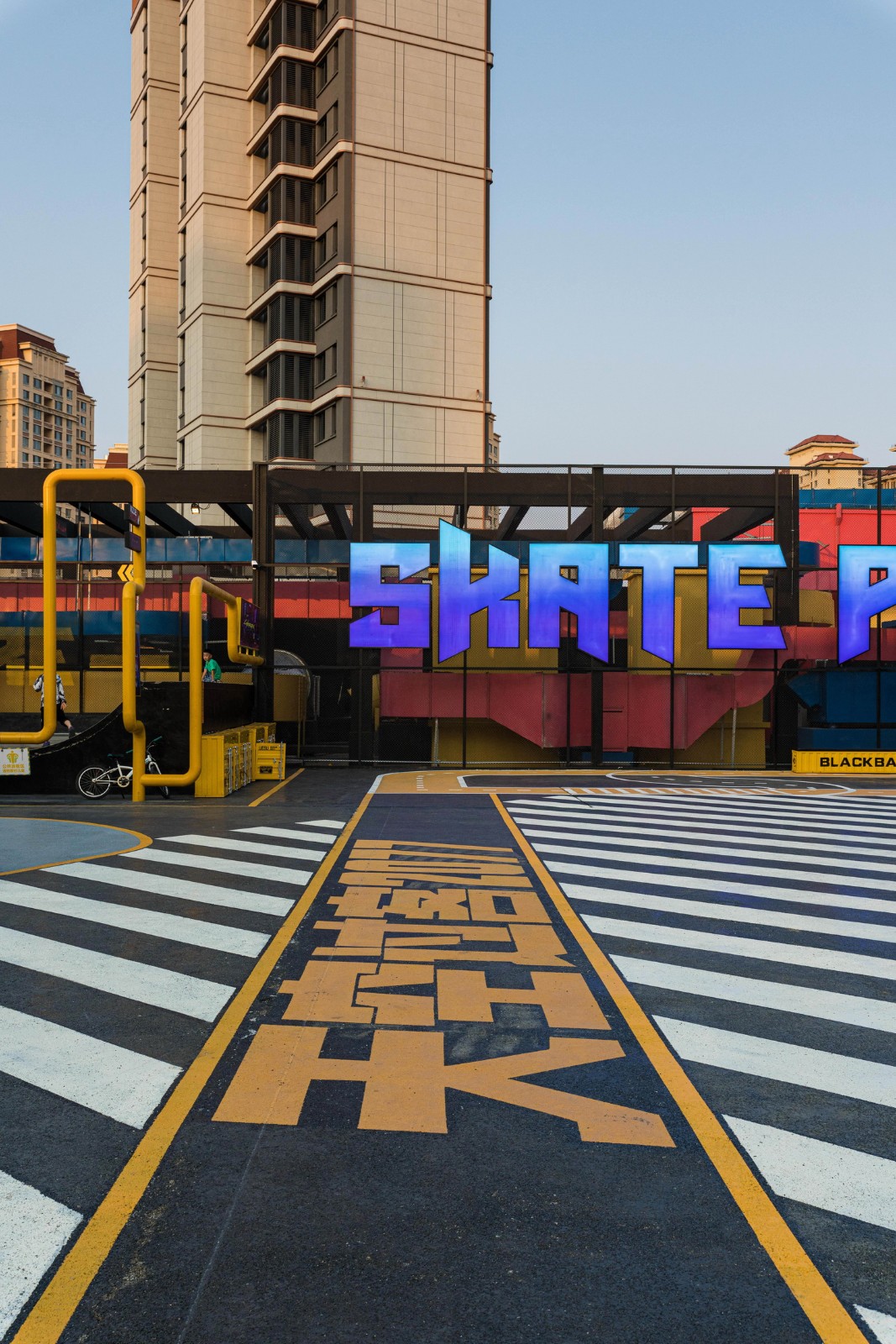 滑板公园以“天空过客”为主题,呼应了场地位于建筑屋顶也暗含了“天空”之意、超现实的街道场景以及线条、灯光营造出的赛博朋克氛围隐喻了的未来感。这些抽象且充满张力的图案覆盖了整个滑板公园的地面和墙面,为滑行者带来身处街头的氛围感。公园中黄色管道、白色的斑马线以及彩色的墙面灯光,缤纷鲜明的色彩都表达着活力与动感,让人置身其中就会被环境氛围所感染。