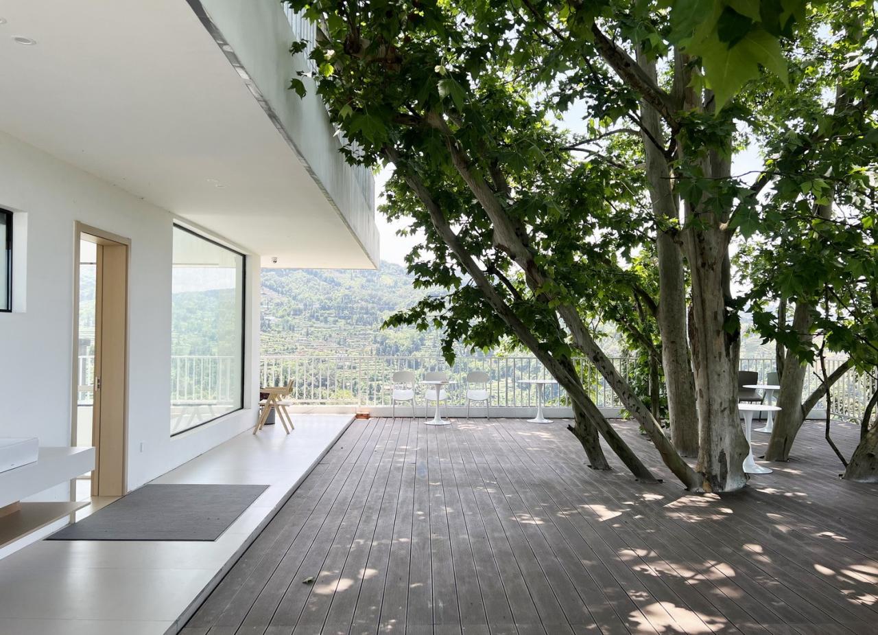 我们希望呈现纯粹而且低调的建筑特质,为了更好地实现建筑漂浮于茶园之上的设计概念,我们将建筑一层外墙及落地窗进行缩进,加大了建筑阳台的出挑尺寸,使得挑檐成为建筑主要的表现元素,配合层层缩进的设计,采用白色外墙涂料,形成建筑水平方向漂浮的体量感。