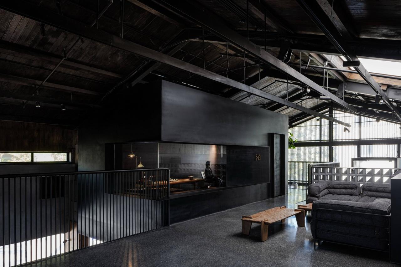 三层室内原有石膏板吊顶被拆除,裸露的原木人字梁结构被保留,并对之梳理剔除后新造金属构件、黑色金属包裹的BOX茶空间体块,置悬于三层中庭,工业风茶水吧、复古开放式办公区分布其中。新与旧在这里激烈地碰撞与交织,呈现出后现代解构主义风格。
