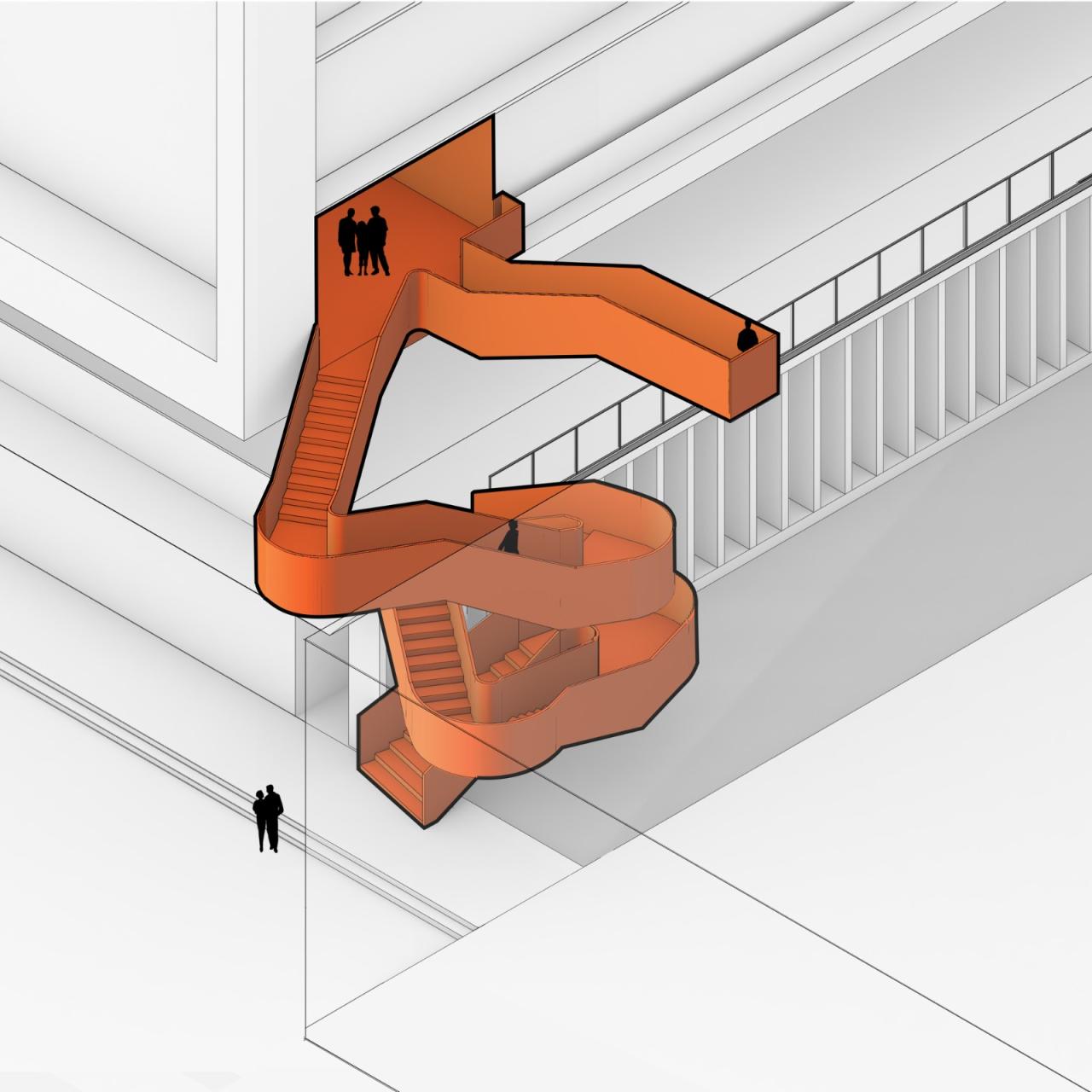 变化的“混天绫”传说中的“混天绫”千变万化,具有翻江倒海的神力。趁着小马酣睡,它也在场地内玩耍起来,所到之处的建筑都变得充满想象,原先邻而不通的小学和幼儿园校舍也收获了全新的联系。小学主入口处的“混天绫”是一部飘逸缠绕的楼梯。