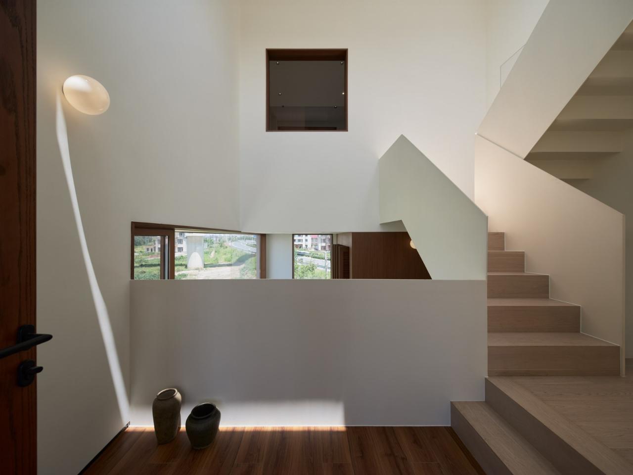 建筑南侧三层四层以两个相互咬合并错动退让的阳台形成立面上“crossing”的关系,三层儿童房的内阳台和四层主卧的露台呈对角线设置,与同样呈对角设置的三层客卧和四层主卧的方形玻璃窗构成了“X”,这种在垂直方向的纵深变化使得不同房间的风景变得富有层次,是一种“纷至沓来”的诗意,消解了水平、垂直、斜向与内外空间的边界,也消除了过极小基底面积下“火柴盒”轮廓带来的敦实感。建筑它以坚实和脱离的背影与象征速度与陌生的城市告别,而用柔软与开放的面庞朝向日渐衰老与凋零的村庄。南侧二层书房设置转角玻璃窗,延伸到西侧,间之以似窗似门的透明洞口,紧接着便是三层高度上的横向长窗。西侧洞口横竖的几何变化削弱了山墙实面的厚重感,也为三层儿童房的书房提供了内化的风景。北侧唯一的两个洞口正是一层客厅和二层起居室的通高,建筑内部空间关系以最直白的几何语汇反映在立面,也是对室外朴树景观的借景。