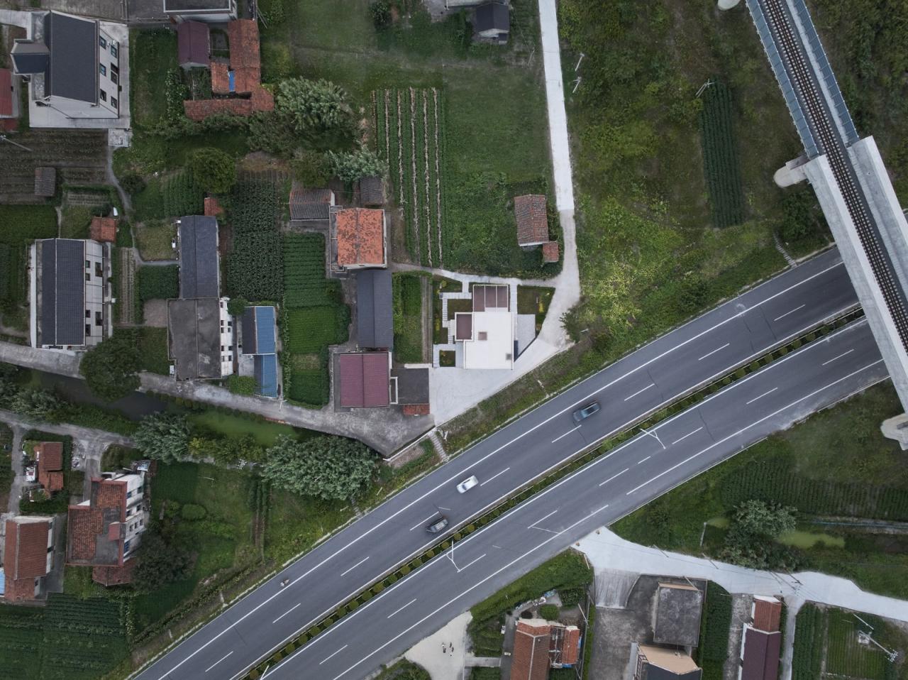 但我们依然在二层以上的空间里,预留了丰富的看与被看的关系。相对于一层的完全敞开,二层以上的互动则更加暧昧,通过一系列连续的通高彼此联系。“退休”之后的彭先生一家以炒股为主业,通高在空间图形上如同股票连续涨停的曲线,使新彭宅成为朋友们口中的“涨停之家”。“涨停”通高作为住宅风水的另类演绎,也会给这一家人带来更多的吉祥与好运。我们将这个住宅命名为Crossing House,就像它在鸟瞰图中所呈现的,一个位于交叉口的房子。回不去的乡村与无法告别的城市,我们正处在这样的交叉口,而这个房子的内部也是一个交叉口,通向两种全然不同的生活方式。