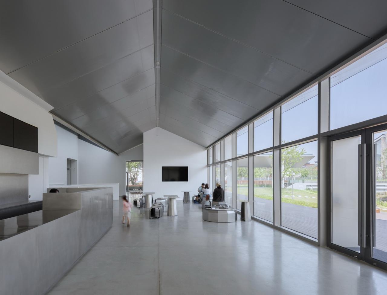 在主展厅外围的小展厅和咖啡厅,我们在西、北两面通过落地窗引入了更多自然光和外部的风景;而在南侧和东侧,又需要用半透明的界面,对外部的光景或场地有所屏蔽,为此我们特别设计了米粒子图案的印花彩釉玻璃,米粒的倾角与坡屋顶的斜度相同。