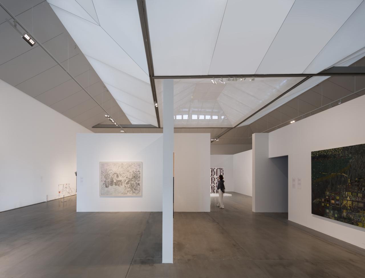 主展厅中的照明是人工光与自然光的结合。阳光从中央高侧窗采入,经过锥形穿孔板和坡顶光膜的过滤,均匀地漫射下来,再次定义了风车形的四组坡顶,给整个展厅带来柔和又富于变化的光线。布展和拍摄期间,我偏爱在白天关闭射灯的时刻,站在一角,看过滤后的天光流连在空间的阴翳里,给艺术品笼上一层幽微的光韵。