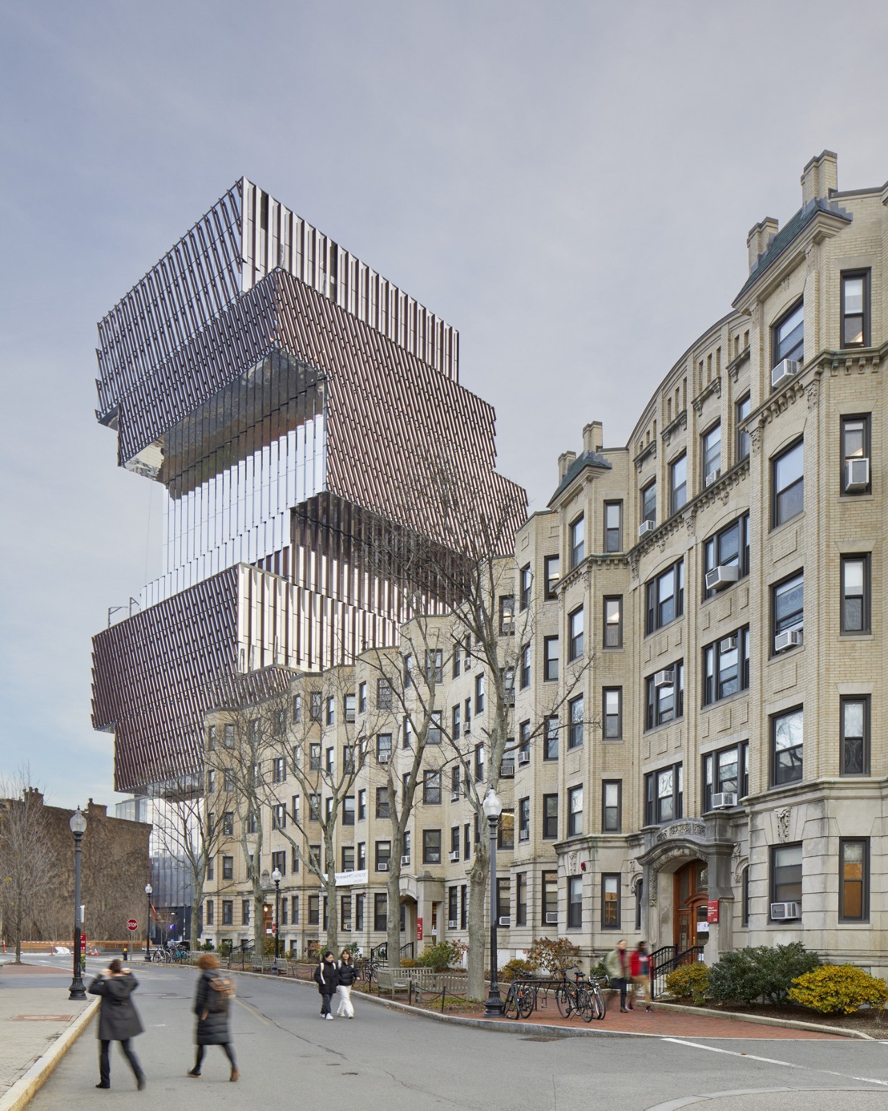 该中心巍然耸立在查尔斯河畔,楼高 19 层,占地面积 345,000 平方英尺,是波士顿最大的、可持续的、不使用化石燃料的建筑。其悬臂式体量上设计有红褐色对角百叶窗(最大限度地减少太阳辐射,同时最大限度地提高遮阳效果)和闪闪发光的镜面锯齿外墙,这些外墙位于三层玻璃幕墙之上。 这些设计元素不仅为建筑增添了独特的线性美感,还有助于提高舒适度和可持续性,使建筑冬暖夏凉。