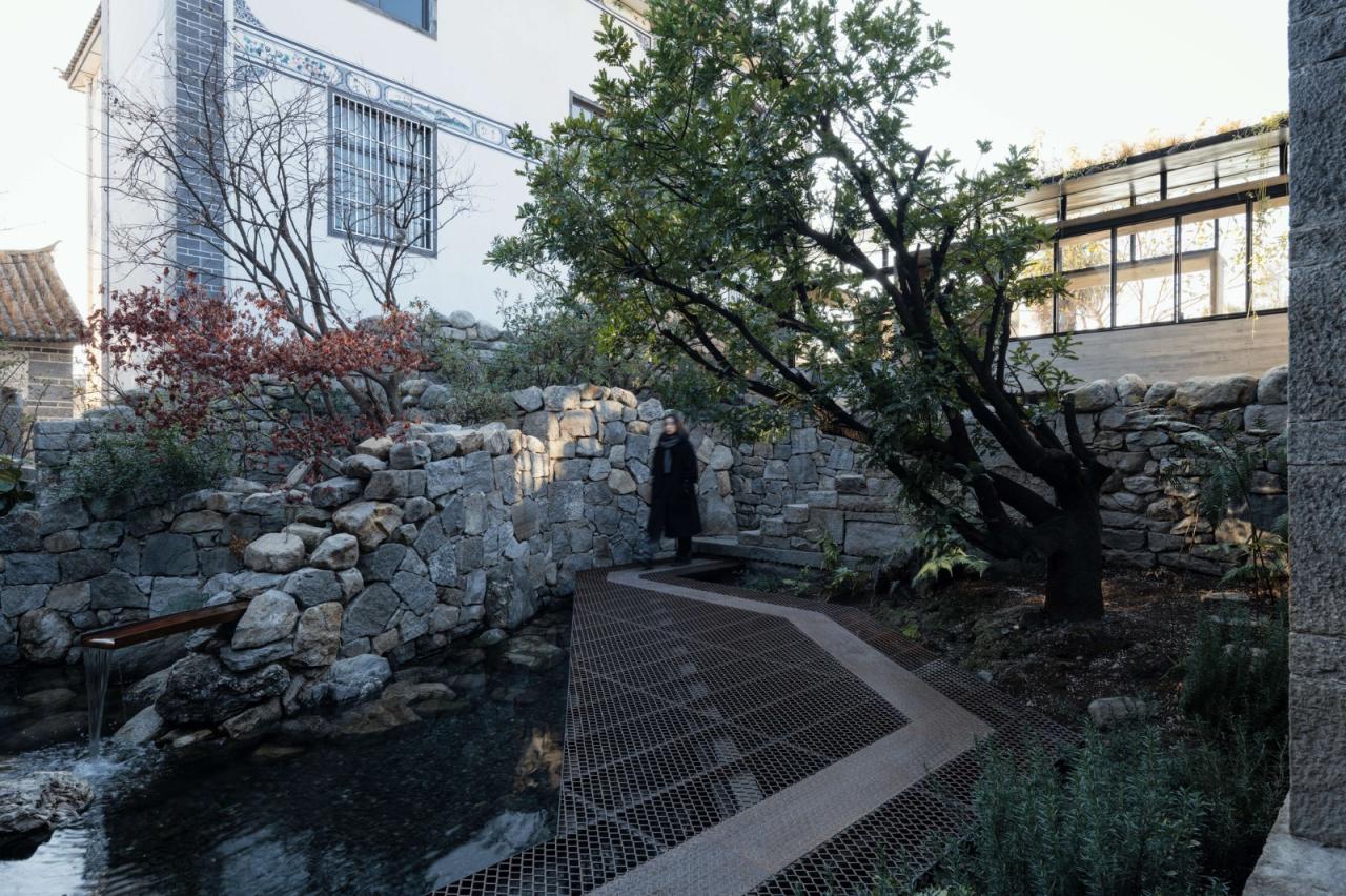 化墟为园—从孤立的建筑走向编织的场所一期的石屋和北楼改造完后,我们于次年7月搬了进来。与自然亲近的新工作环境让大家兴奋不已,但与此同时,半完工的现场状态也越发暴露出整体空间体验上的问题,设计初期就开始思考的“园林线索”中途被紧张的主体建筑改造工期所打断,又被每天站在院子里的种种不适体验重新激活了。首先,石屋和北楼因为建造体系的不同显得有些各自孤立,单体建筑的存在感需要被弱化,而院落的整体场所体验需要被加强。其次是尺度感的失衡,传统白族院落对应的舒适建筑尺度是老房子一层半的檐口高度,而现状内院两层半高的北楼和东侧邻居三层半的新白族民居对内院形成了很强的压迫感。最后是庭院空间的直白和仓促,光秃秃的院子一进门便一览无余,之前设想的围绕庭院的自然生活目前还停留在院子原有的水泥地面上。现场作为“半成品”的这些问题都需要二期设计中以“园林策略”为主线的场所营造来破局。