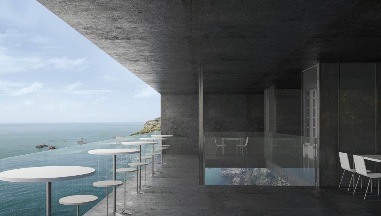 从台阶向下进入建筑,如同进入山体内部,经历厚重墙体的包裹感之后,又在出挑的边缘与海再次相遇,感受在海平面上的漂浮感。悬挑部分地面的开口使人直接感受到悬崖的落差。