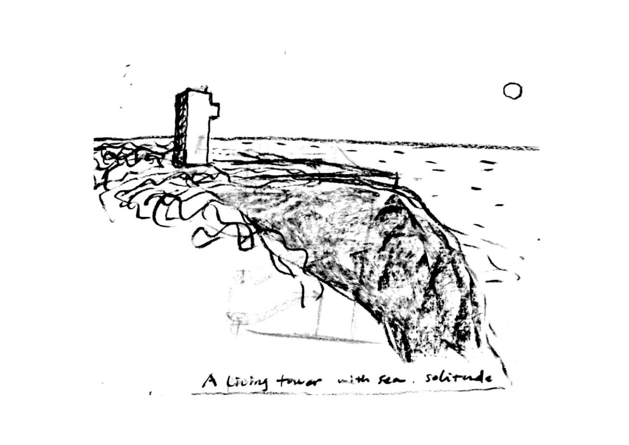 咖啡厅是一个指向地平线的水平面,居住塔则是一个指向天空的垂直体。塔的平面只有 4.5mx4.5m,在周边海的浩渺中,它浓缩为一个点,使力量集聚。