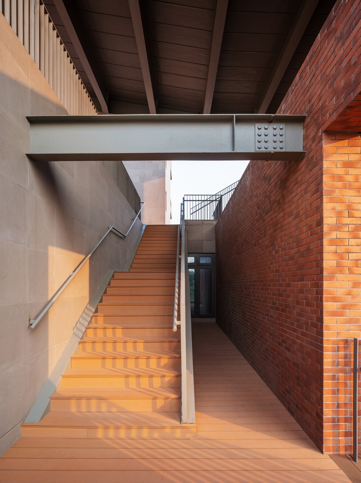 通常位于首层的室外公共空间被移至艺术教学楼的三层屋面,一个宽敞自然、视野广阔的空中平台为课间休憩的学生带来更丰富、有层次感的体验空间。阶梯教室下方的灰空间成为半室外的风雨操场,面向运河开放,形成良好的观景视野。同时图书馆的屋顶向内顺势形成坡度台阶,提供了更为多样的户外交流活动场地。为了保证屋面场地的平整开放,设计运用架空地面的技术手段,将排水及设备安装在屋面之下。