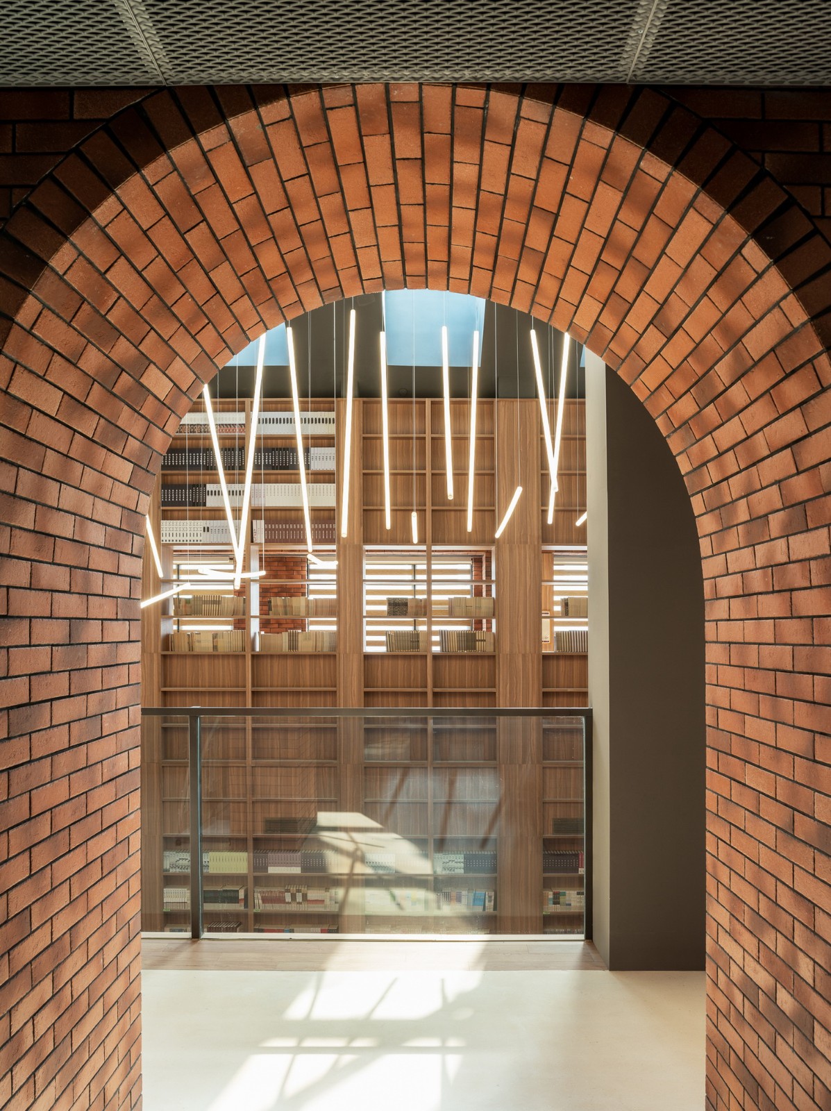 拼贴原型的理念也贯彻到幕墙和室内材质的选择上,在对周边历史建筑风貌进行分析后,建筑师撷取了红砖和混凝土质感的软瓷两种材质元素予以回应,主体的混凝土材质以低调的姿态介入现有场地环境,位于核心位置的图书馆,立面和坡屋面采用红砖风格,回应学校历史风貌,并和谐地融入周边片区的肌理。西立面外墙竖向凹凸变化结合窗户形成韵律。历史感的红砖材料随光线一起从窗外延伸到图书馆室内,达到内外协调融合的整体效果。