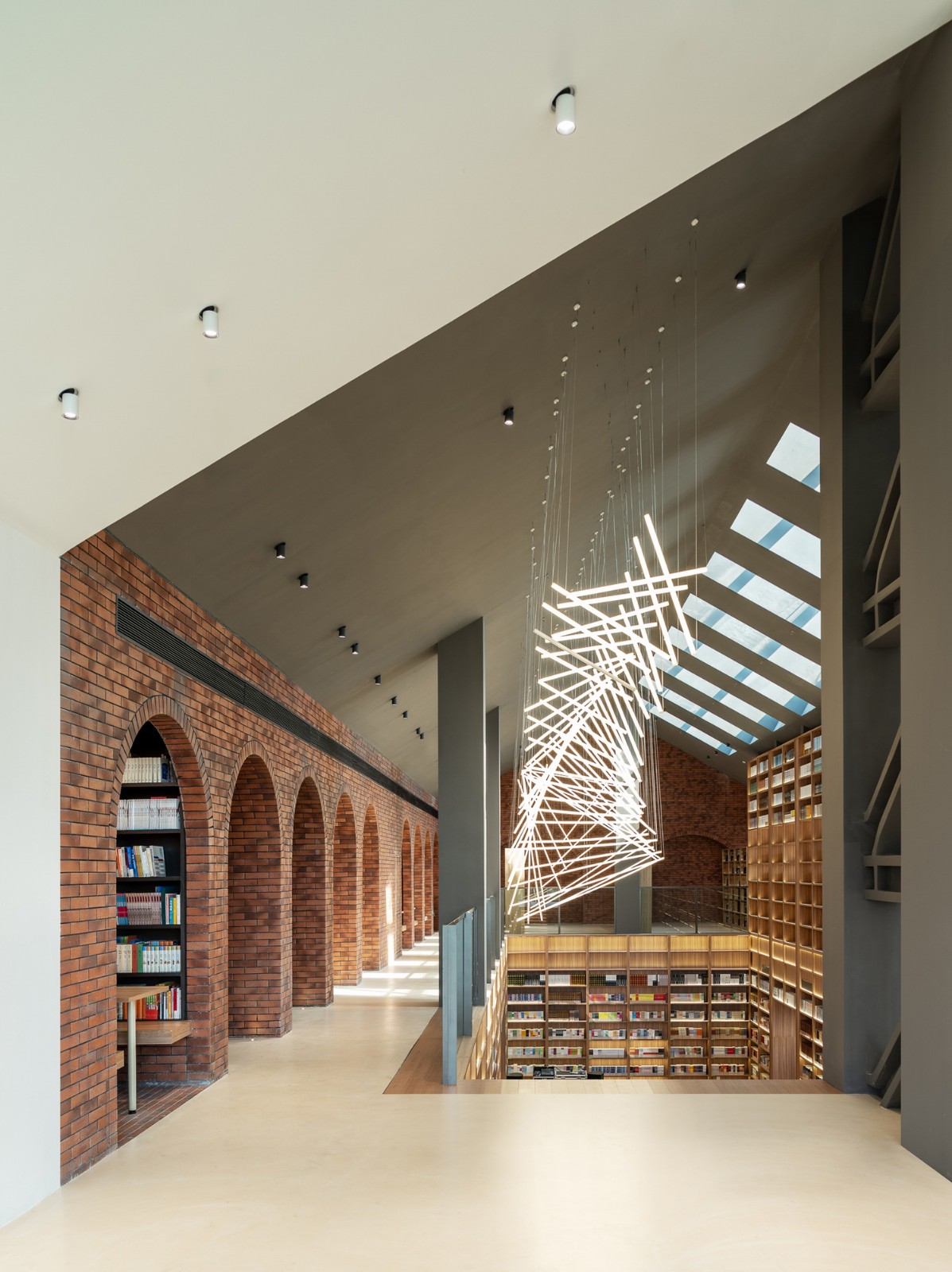 综合楼室内设计也由南沙原创执笔完成,根据空间个性的不同,采用花砖、木质饰面和清水混凝土墙面等具有不同“情绪”的材料进行拼贴,使每个空间呈现出各自的“表情”,让不同时段的使用者随时切换情绪,极大化个人对空间的体验。设计师在图书馆中庭挑空空间内设计了一个灯光装置,以灯带构成三角形,三边分离,阵列旋转渐变生成空间中三维立体形态,刻画出空间的高度进深,形成视觉中心。